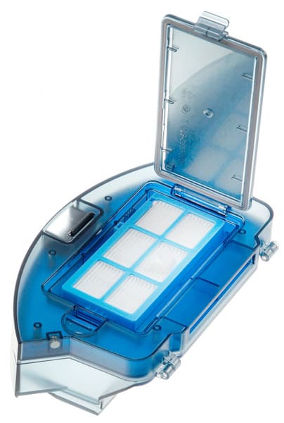 Модули пылесборника и влажной уборки устанавливаются в один и тот же «слот» и фиксируются с помощью защелки-кнопки. Модуль сухой уборки имеет откидную крышку, которая фиксируется с помощью той же самой кнопки-защелки. Под крышкой расположен прямоугольный фильтр тонкой очистки, состоящий из предварительного поролонового и HEPA-элемента. Для получения доступа к HEPA-фильтру придется открыть еще одну пластиковую крышку на защелке.