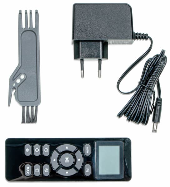 Инфракрасный пульт дистанционного управления питается от двух батареек типа ААА. Он имеет собственный черно-белый экран и десять механических кнопок, нажимающихся с характерным щелчком. Лицевая сторона пульта — глянцевая, что, на наш взгляд, не особо хорошо — рано или поздно поверхность поцарапается и будет выглядеть не слишком презентабельно.