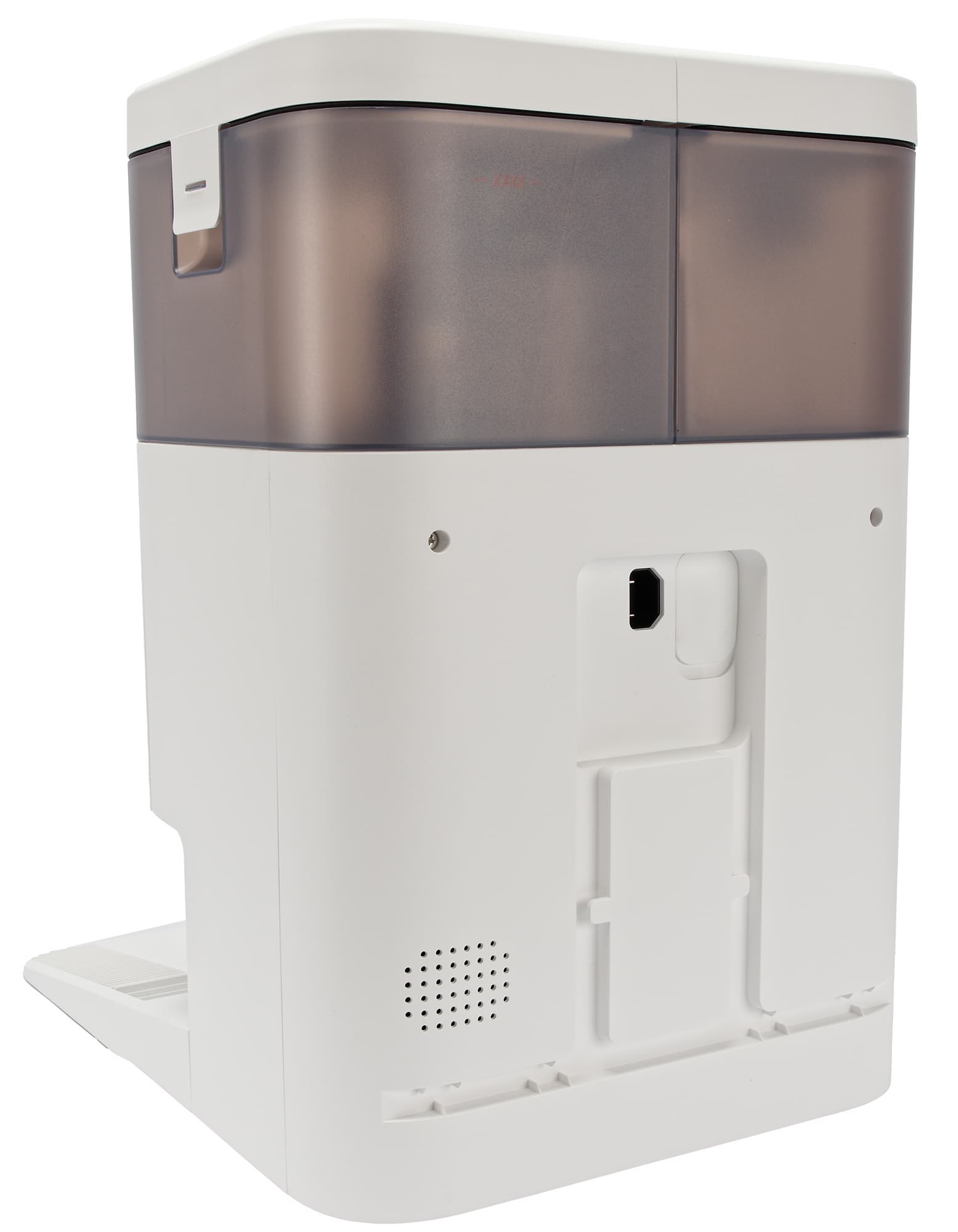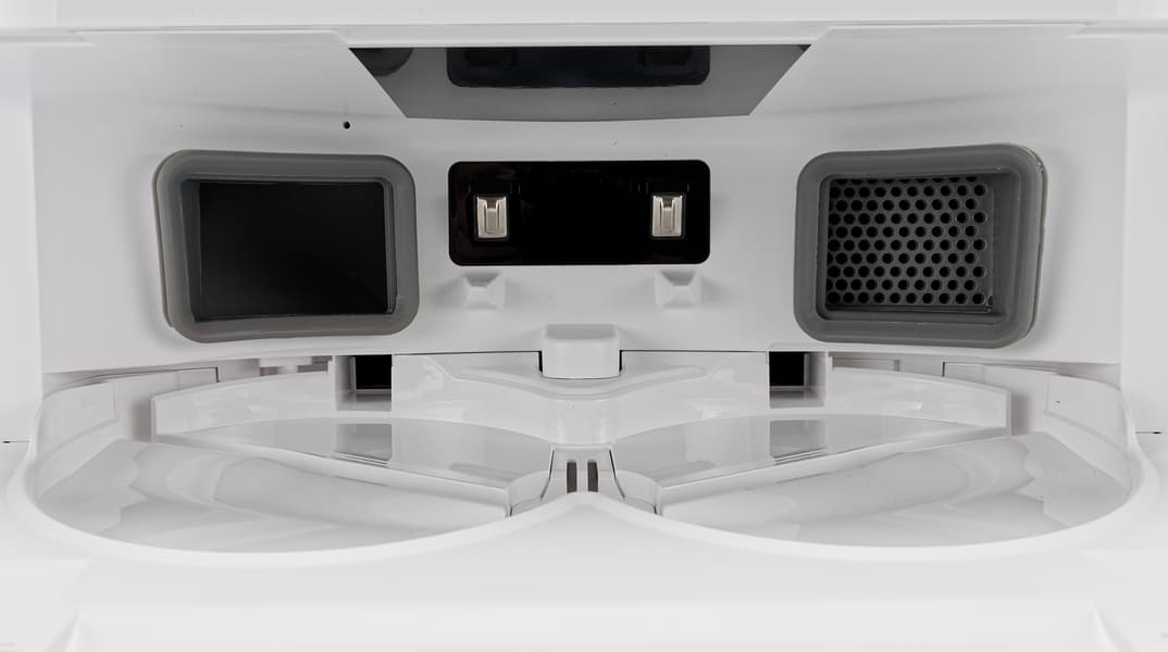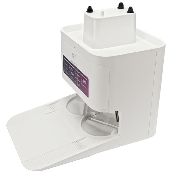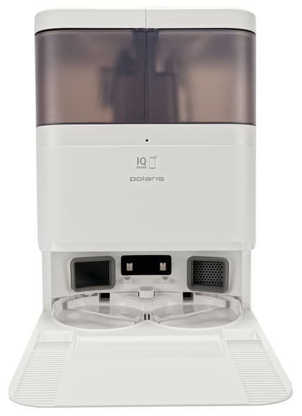 Базовая станция оборудована большой консолью для заезда робота. По центру парковочной ниши расположены контакты для зарядки, по бокам — два отверстия, через которые происходит самоочистка (сброс мусора). Снизу — отверстия для подачи теплого воздуха (сушки салфеток).