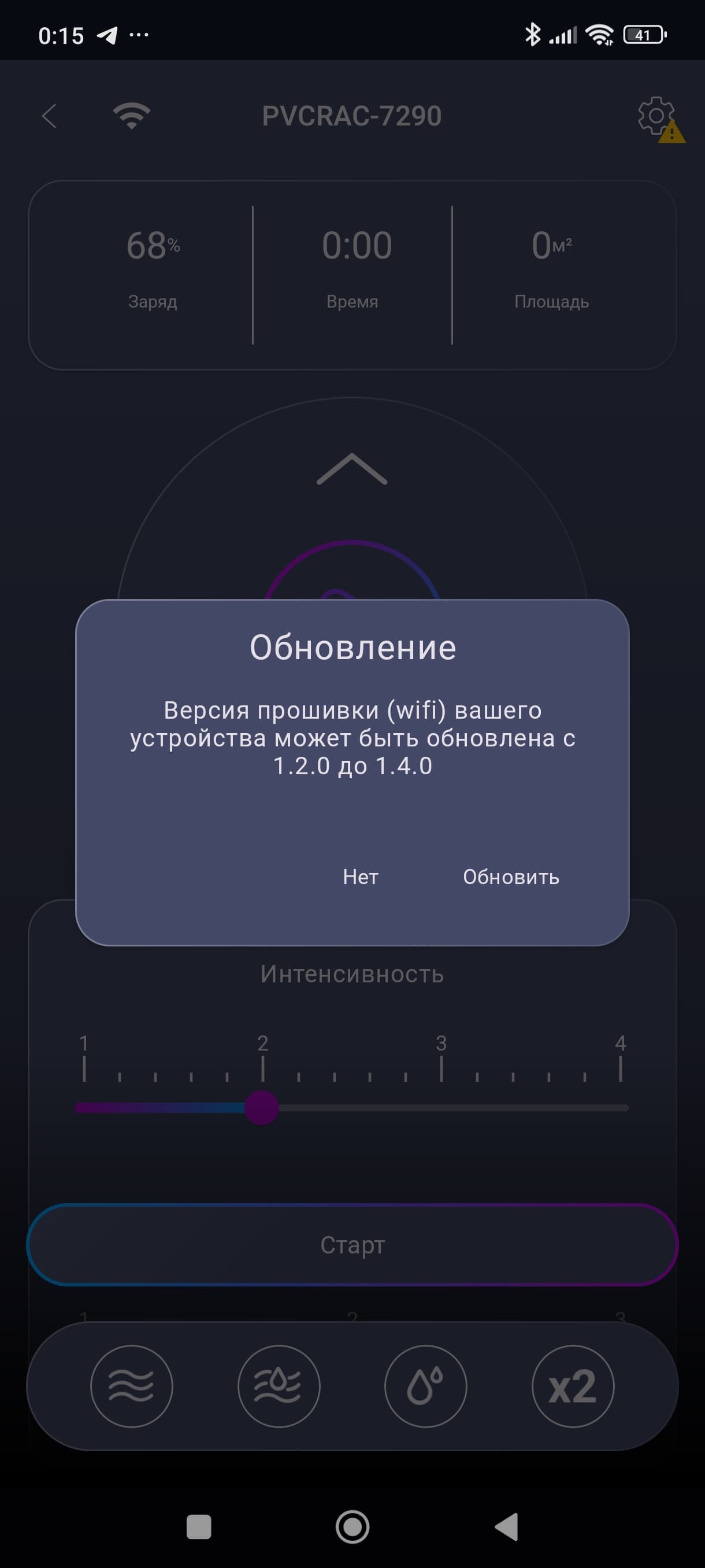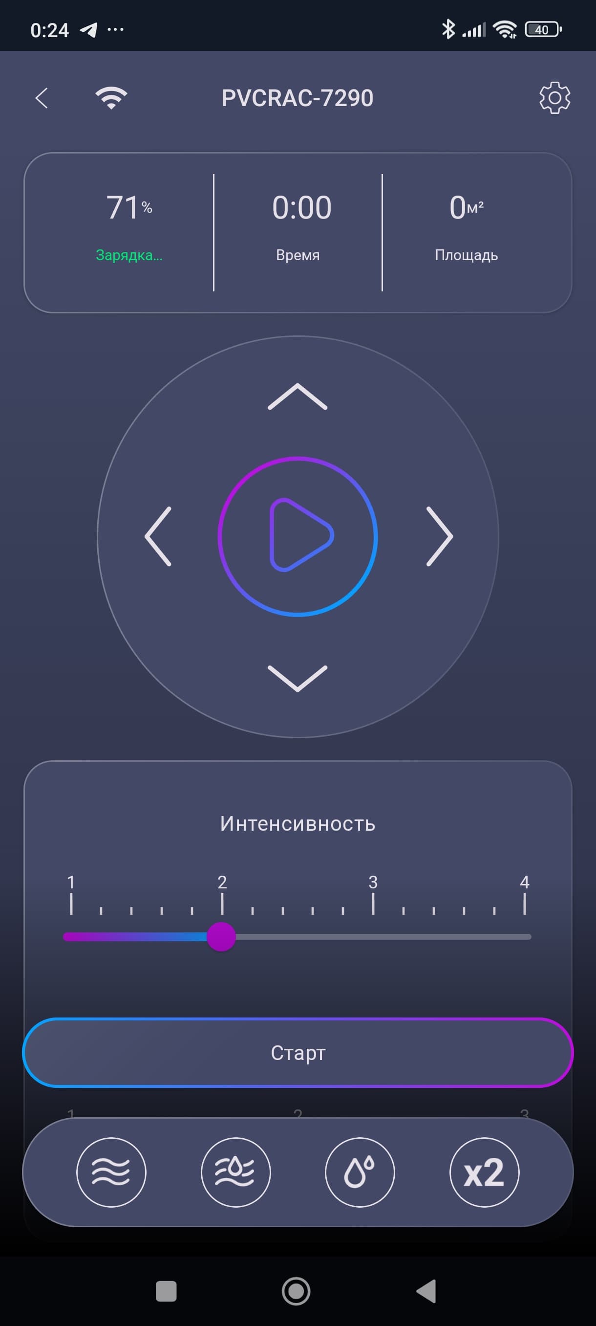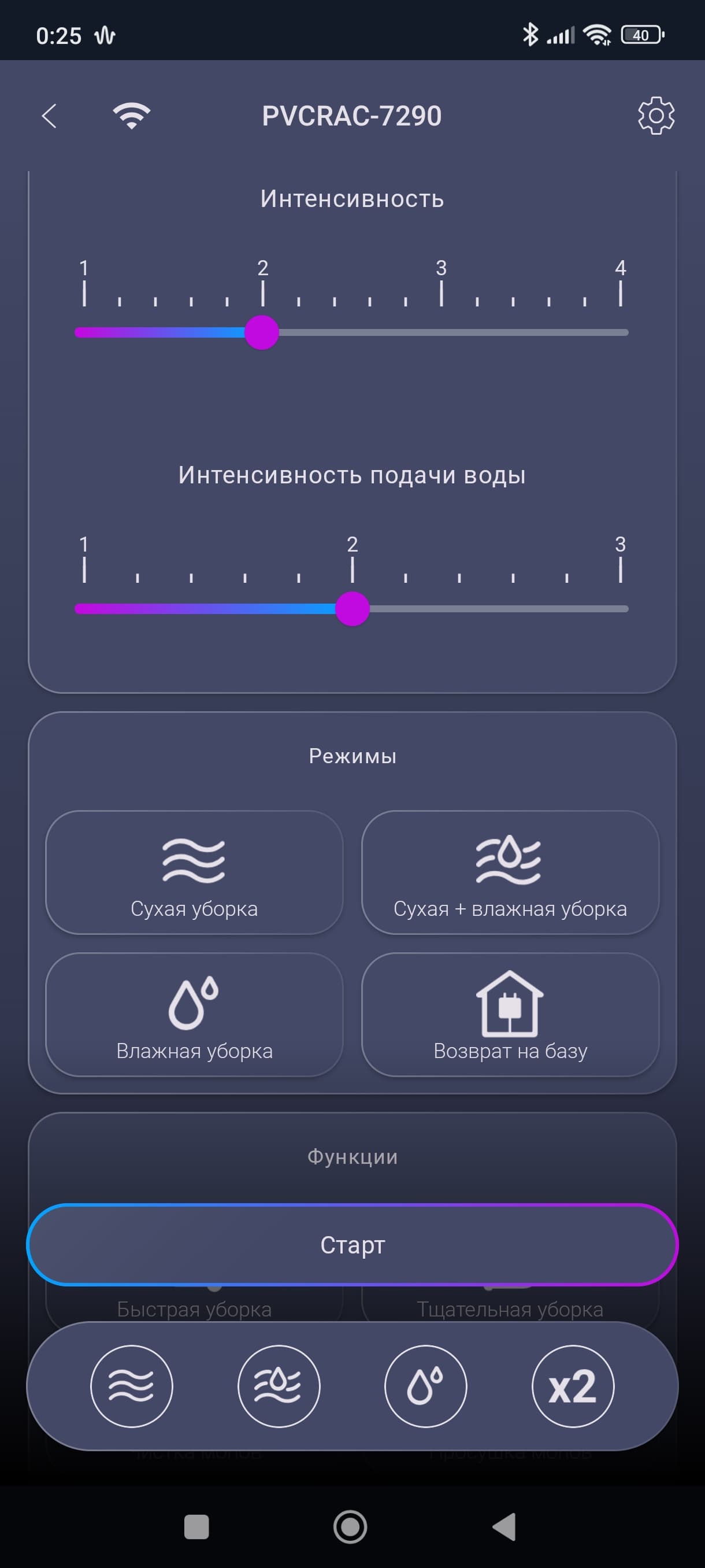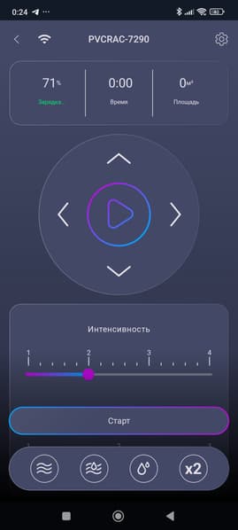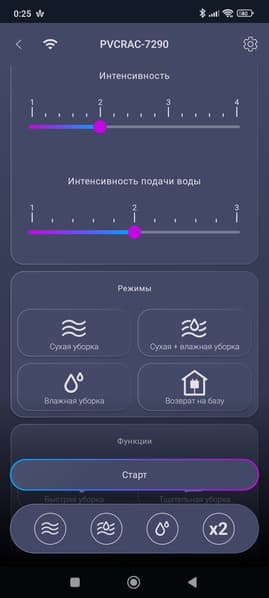 Ниже находятся настройки интенсивности всасывания и подачи воды, а под ними — кнопки различных режимов.