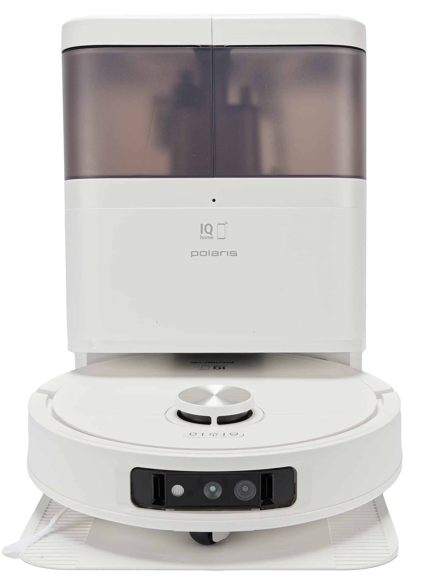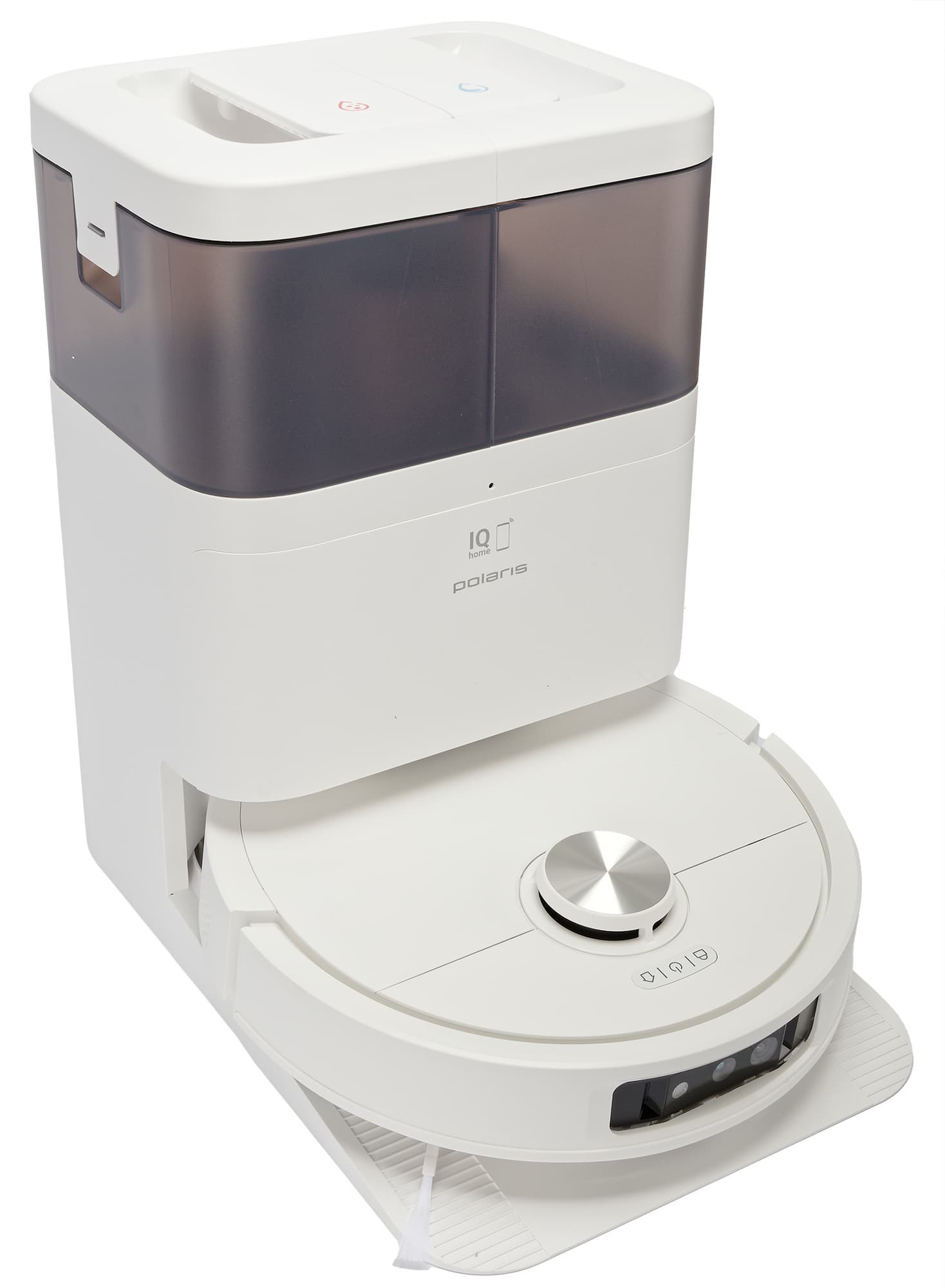 Когда наш Polaris завершает свою работу, он подъезжает вплотную к базе, разворачивается к ней кормой и стыкуется с раструбом системы самоочистки. После этого робот сбрасывает мусор и запускает промывание и сушку салфеток.