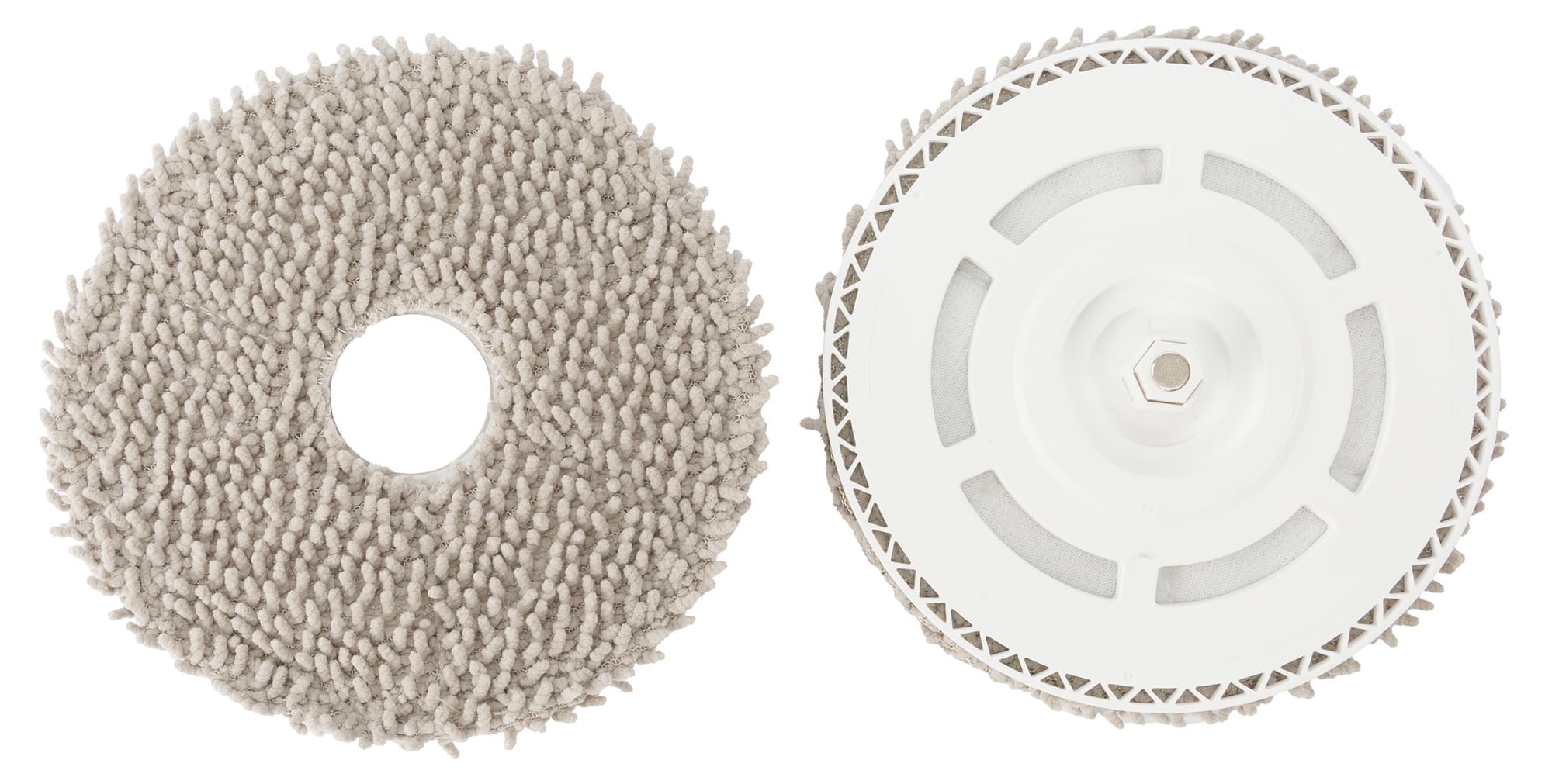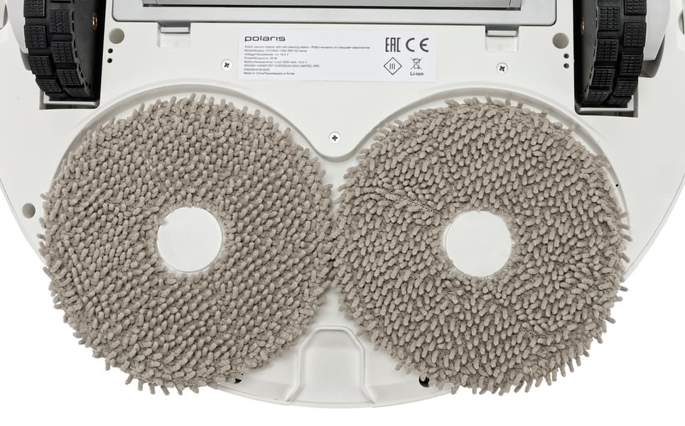 Для влажной уборки к днищу пылесоса прикрепляются две «минишвабры», состоящие из пластиковой основы и салфетки, которая фиксируется с помощью липучки-велкро.
