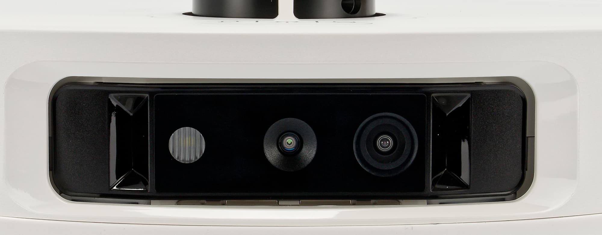 Спереди, как водится, у робота установлен подвижный бампер (он же — физический датчик столкновений). У более бюджетных моделей бампер оснащен лишь инфракрасными сенсорами, а у нашей модели между ними расположилась видеокамера, в том числе выполняющая роль интеллектуального сенсора. «Объектива» тут два, а в дополнение к ним имеется светодиод для подсветки рабочей зоны (свет включается в условиях недостаточной освещенности).