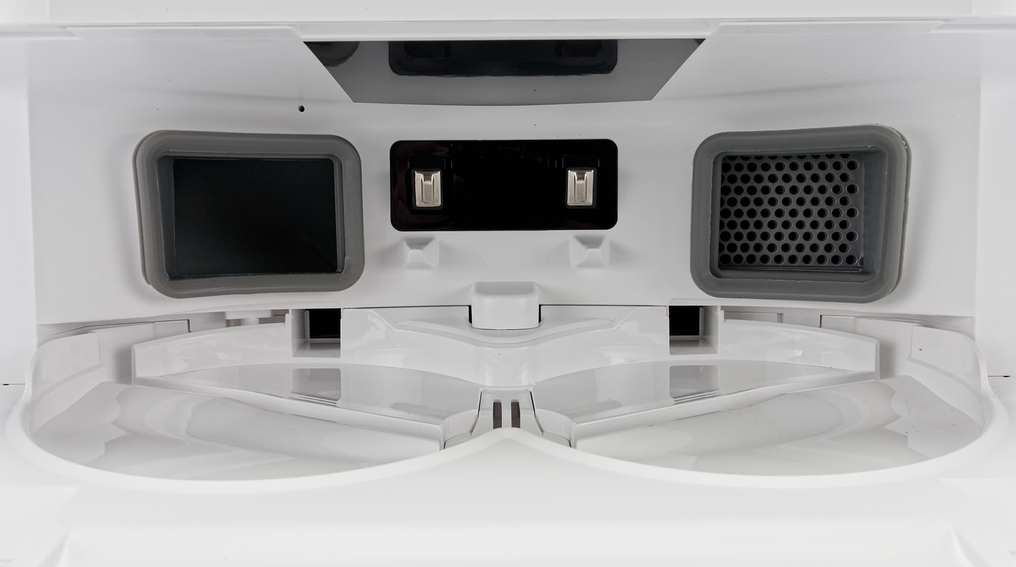 По бокам сенсоров нет. Обычно у подобных моделей мы ожидаем увидеть один боковой «датчик стены», однако у данной модели его не обнаружилось. Таким образом, сбоку мы видим лишь решетки для выхода воздуха и для встроенного динамика.