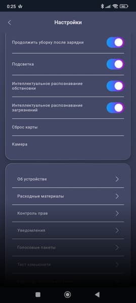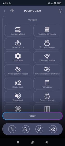 С помощью набора кнопок мы можем задать дополнительные параметры уборки (поведение робота на коврах, уборка по расписанию, режим двойной уборки и т. п.), а также вручную запустить очистку и просушку мопов, сброс пыли и т. д.
