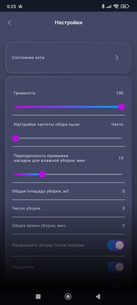 В верхней части экрана мы можем проверить заряд аккумулятора, узнать время текущей уборки и убранную площадь.