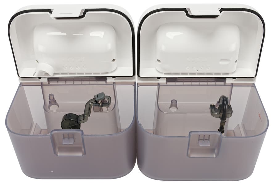 Сверху устанавливаются контейнеры для грязной и чистой воды. Они не слишком велики: 2,3 и 3 литра соответственно.