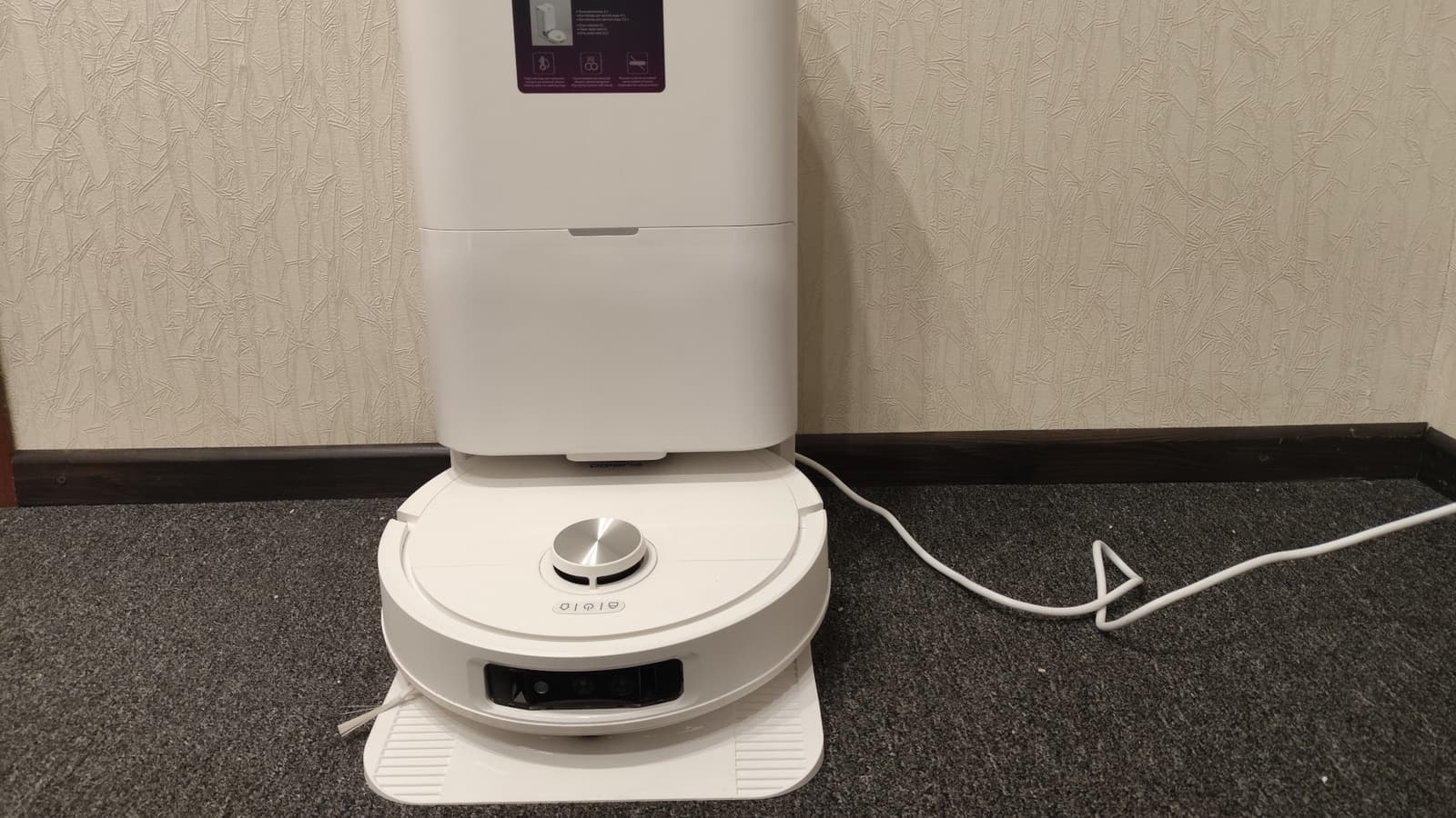 Базовая станция оборудована большой консолью для заезда робота. По центру парковочной ниши расположены контакты для зарядки, по бокам — два отверстия, через которые происходит самоочистка (сброс мусора). Между зарядными контактами — разъем автоматической дозаправки пылесоса чистой водой. Снизу — решетка для подачи теплого воздуха (сушки салфеток).
