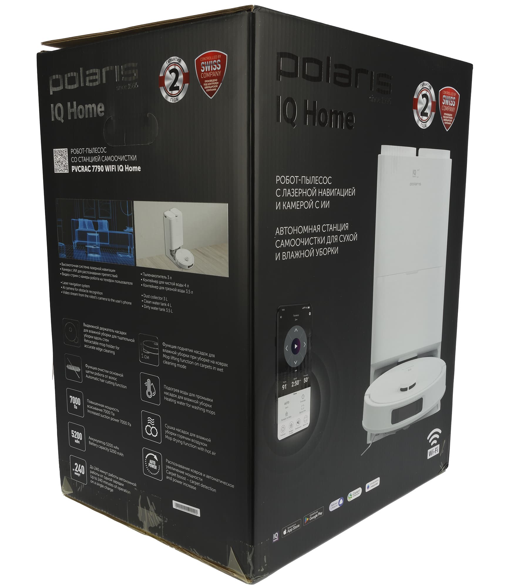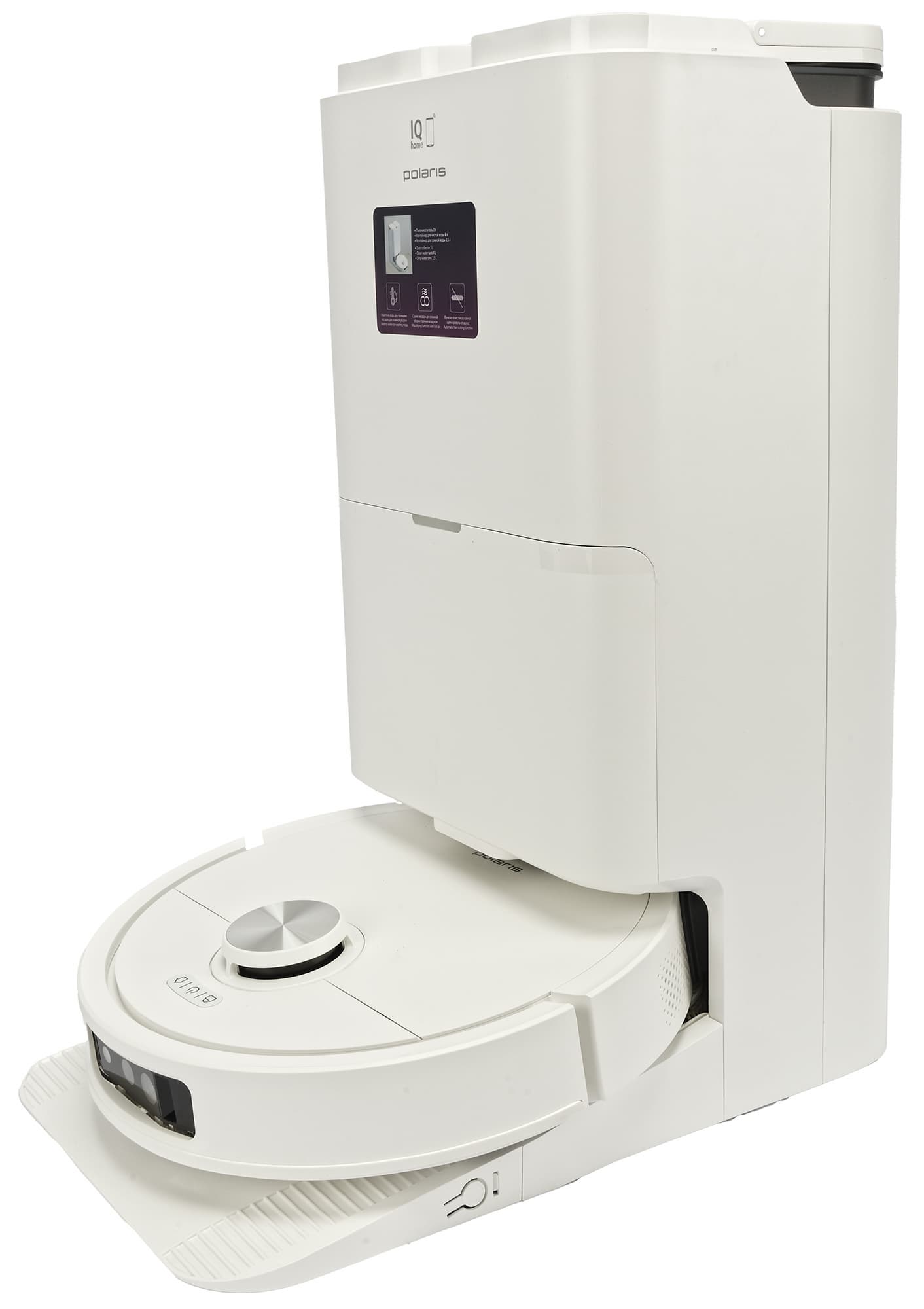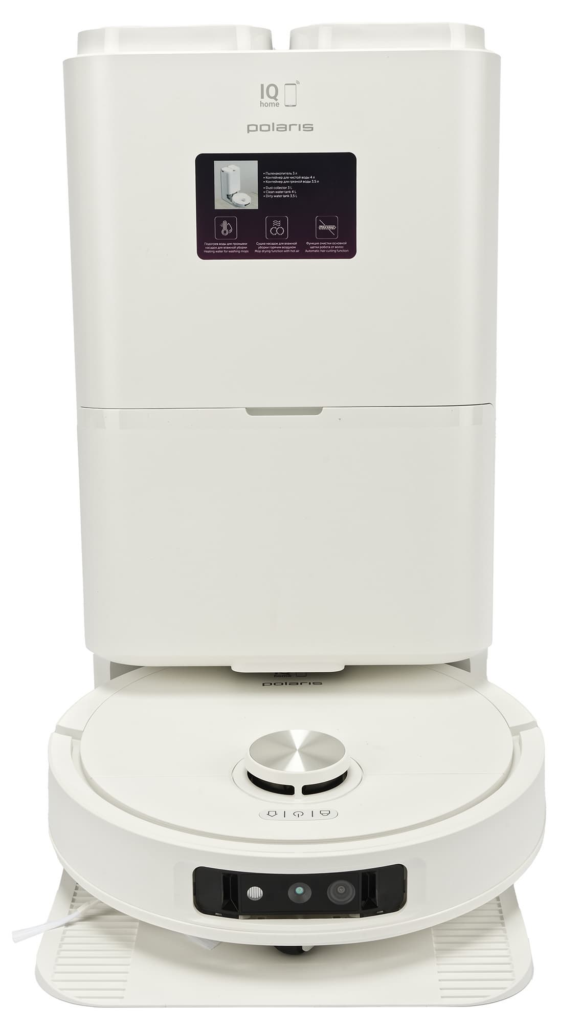 Робот-пылесос Polaris PVCRAC 7790 Wi-Fi IQ Home претендует на звание одной из топовых моделей в линейке Polaris, и в целом заслуживает такого звания. Он обладает множеством функций, обеспечивающих удобную и качественную уборку — тут и встроенная камера с распознаванием препятствий, и перерезание намотавшихся волос на щетке, и выдвижная «лапка», позволяющая протирать пол вдоль стен и под низкими препятствиями, и, конечно, станция самоочистки с автоматической мойкой горячей водой и просушкой салфеток-мопов теплым воздухом.