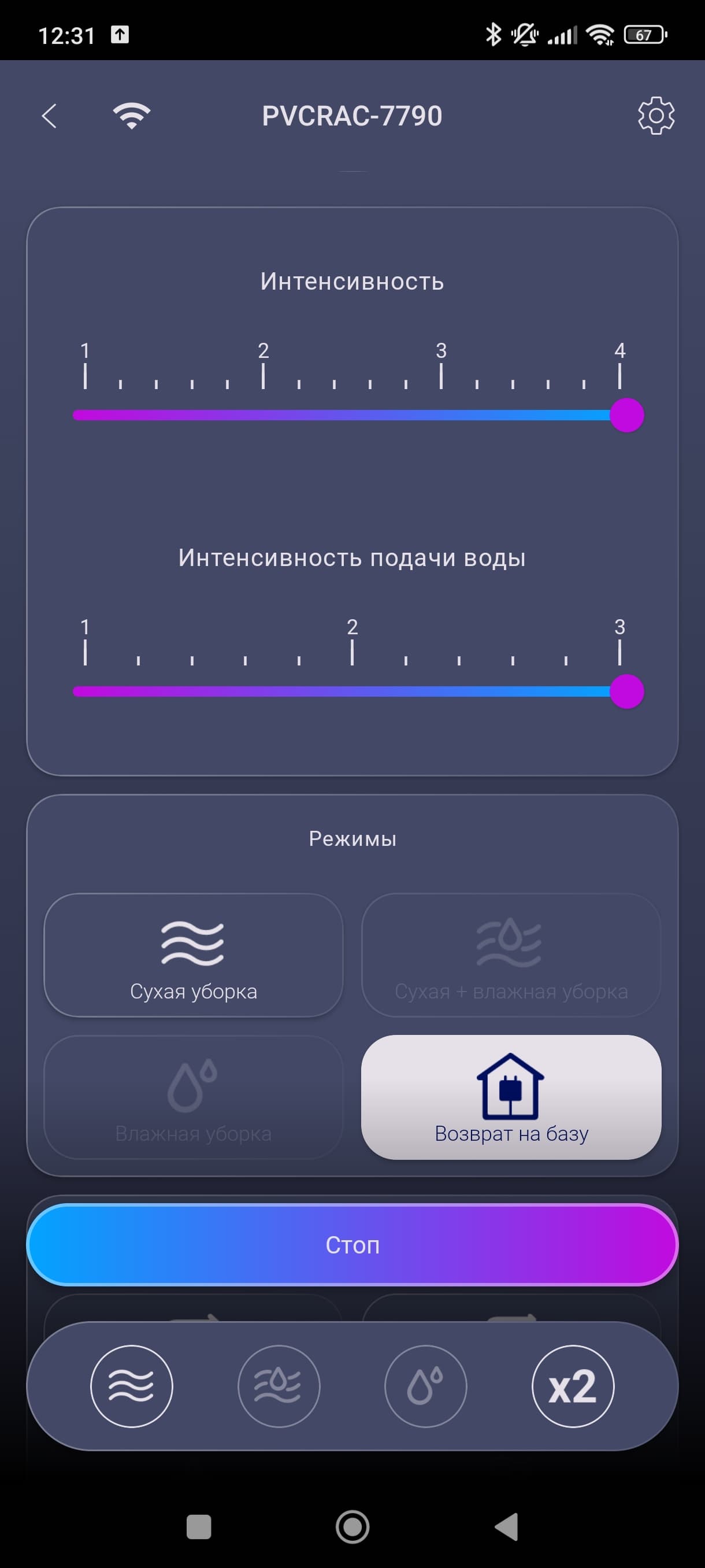 Ниже находятся настройки интенсивности всасывания и подачи воды, а под ними — кнопки различных режимов.