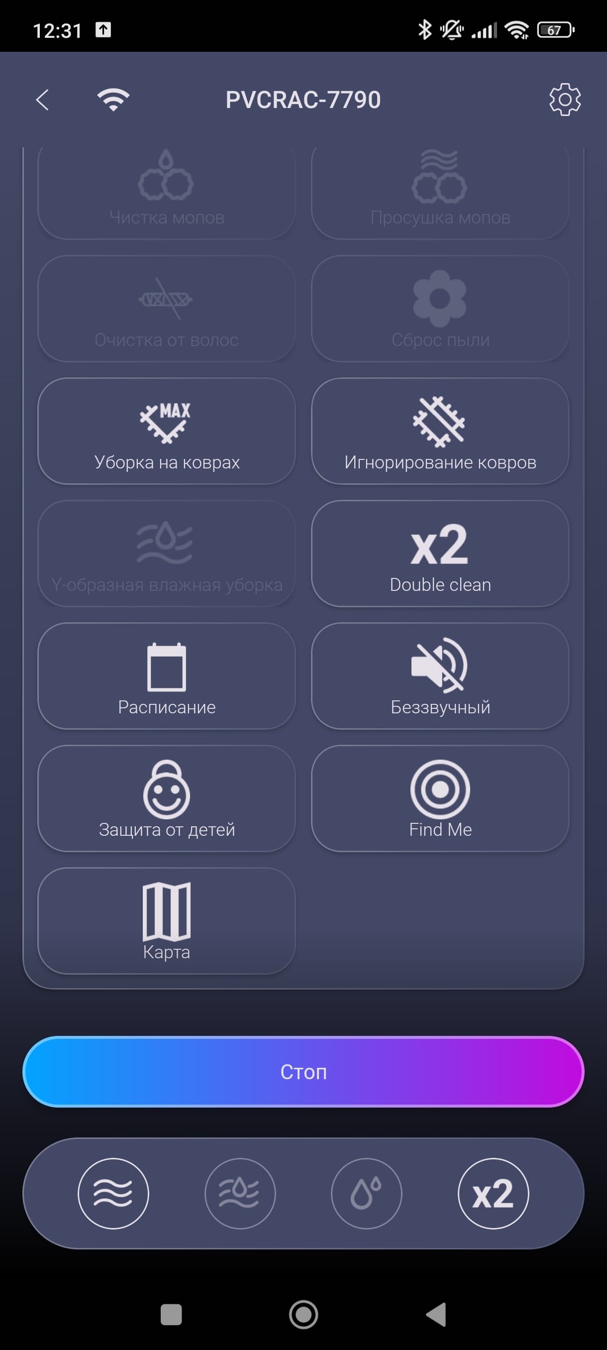 Тут мы можем настроить дополнительные параметры уборки (поведение робота на коврах, уборка по расписанию, режим двойной уборки и т. п.), а также вручную включить очистку и просушку мопов, очистку от волос, сброс пыли...