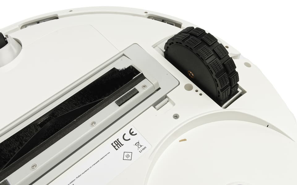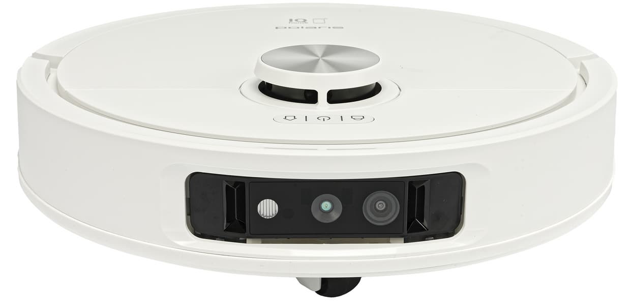 Спереди, как водится, у робота установлен подвижный бампер (он же — физический датчик столкновений). У более бюджетных моделей бампер оснащен лишь инфракрасными сенсорами, а у нашей модели между ними расположилась видеокамера, в том числе выполняющая роль интеллектуального сенсора. «Объектива» тут два (при съемке видео задействован один, мы проверили) плюс светодиод для подсветки рабочей зоны (она включается в условиях недостаточной освещенности). Назначение третьего элемента достоверно установить нам не удалось (инструкция скромно называет все это «датчик обнаружения препятствий»).
