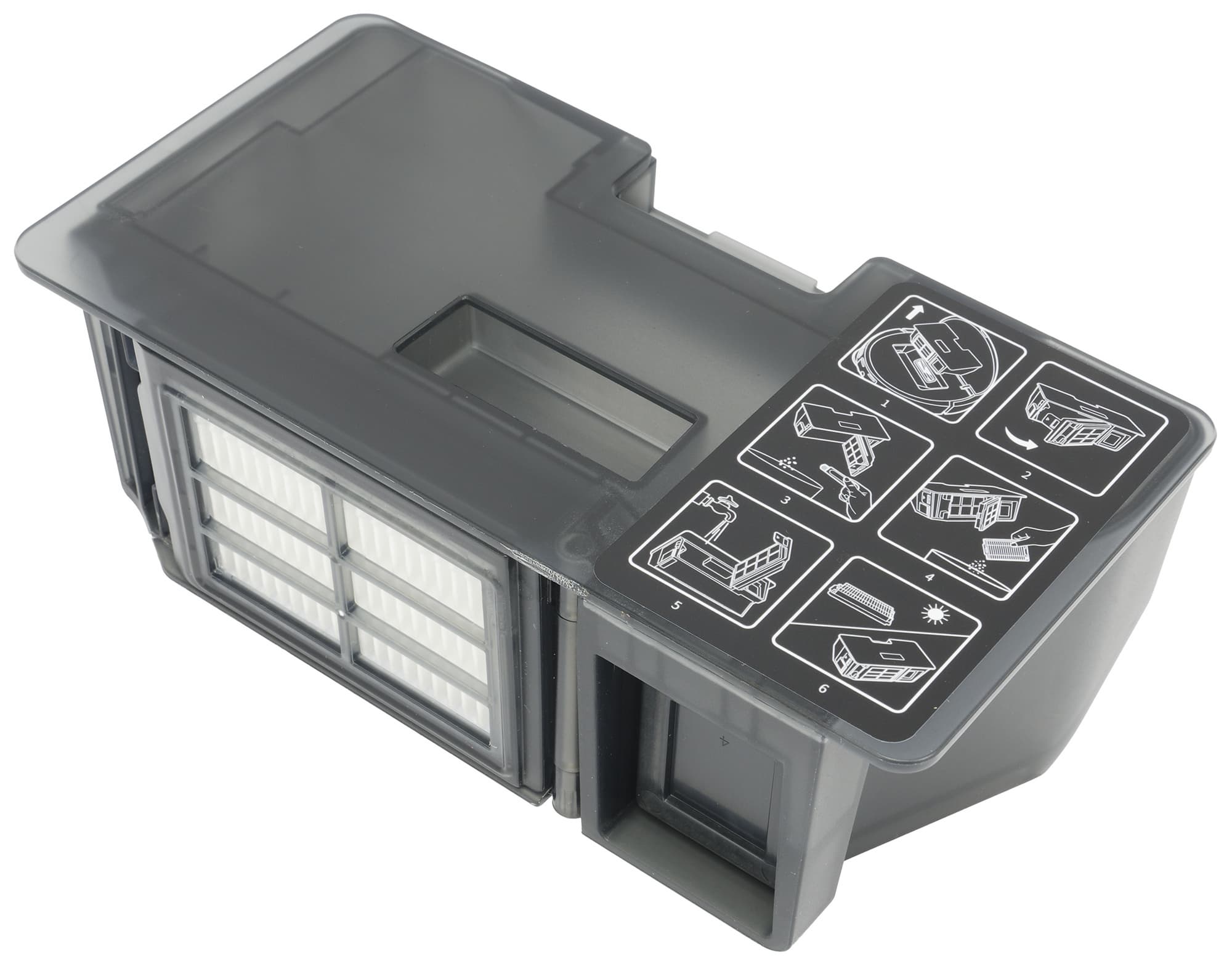 Фильтрация осуществляется с помощью модуля тонкой очистки, состоящего из частой сетки из синтетического материала и прямоугольного HEPA-элемента. Их придется время от времени извлекать и чистить вручную.