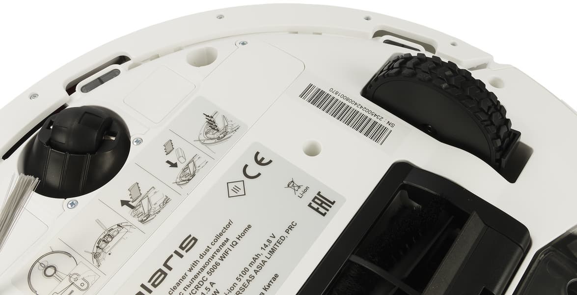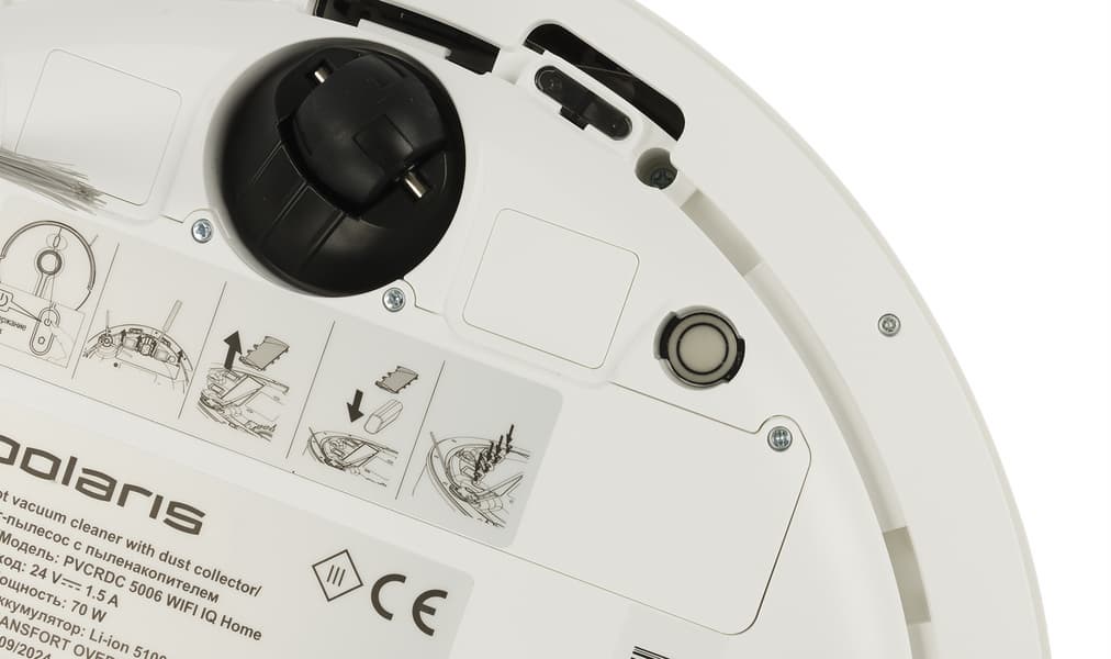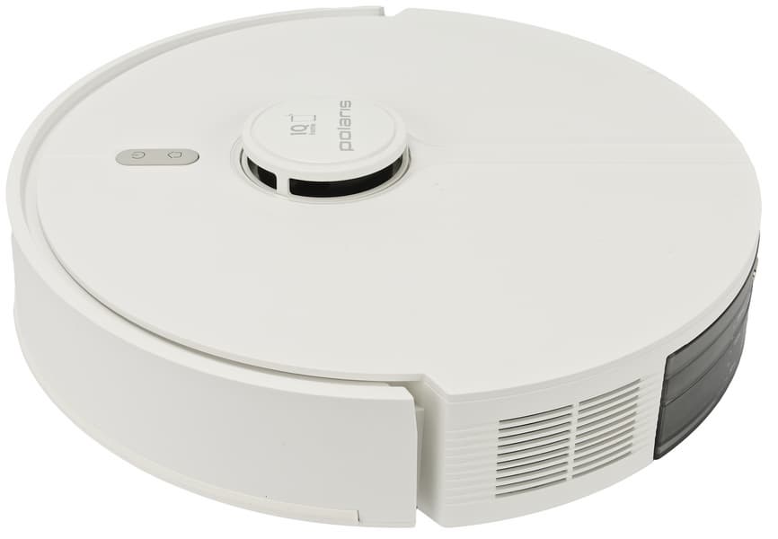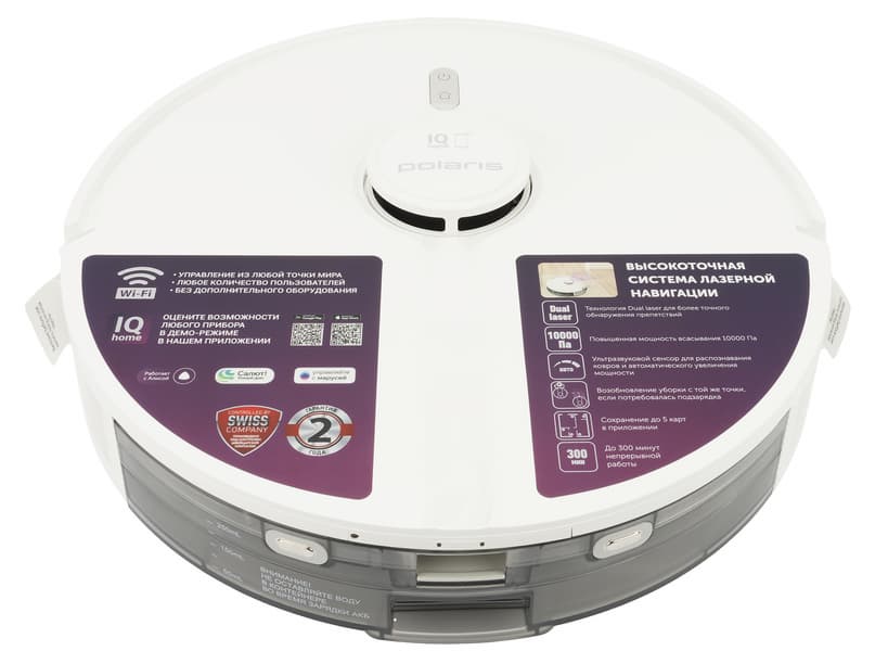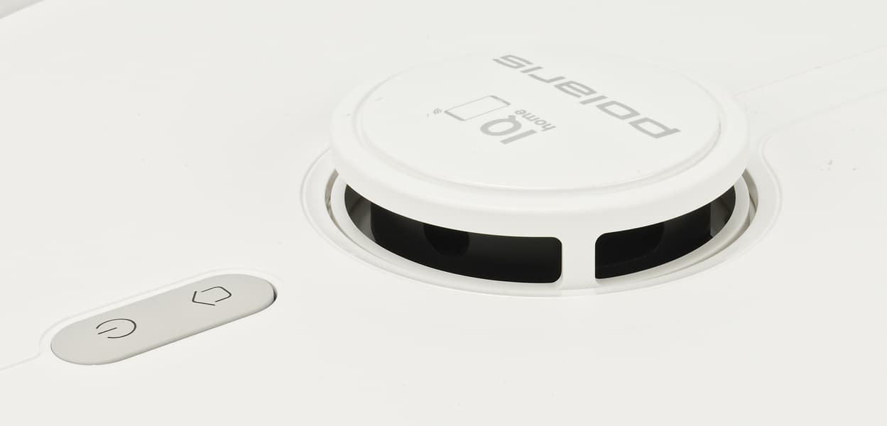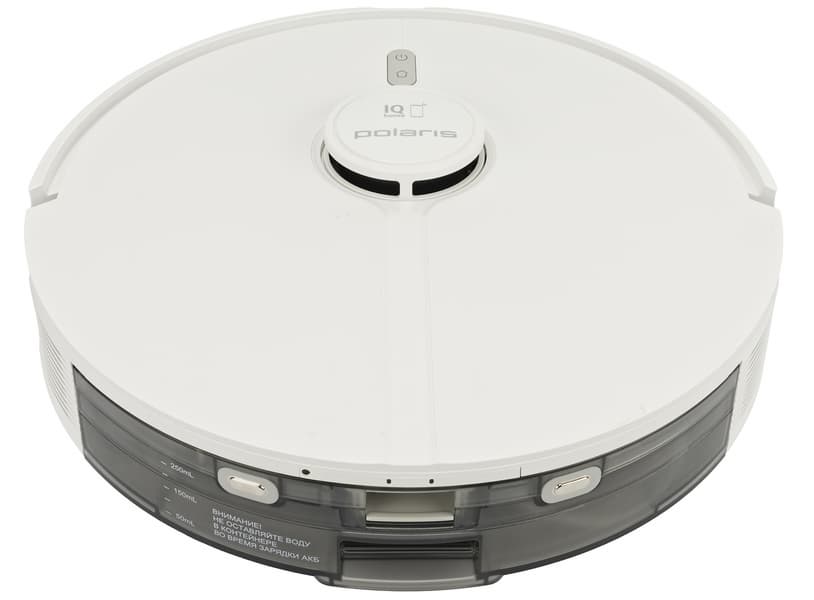 Дизайн без изысков: башенка лидара украшена логотипом Polaris и изображением смартфона с подписью IQ Home (что напоминает нам о возможности управления пылесосом с помощью приложения для смартфонов).