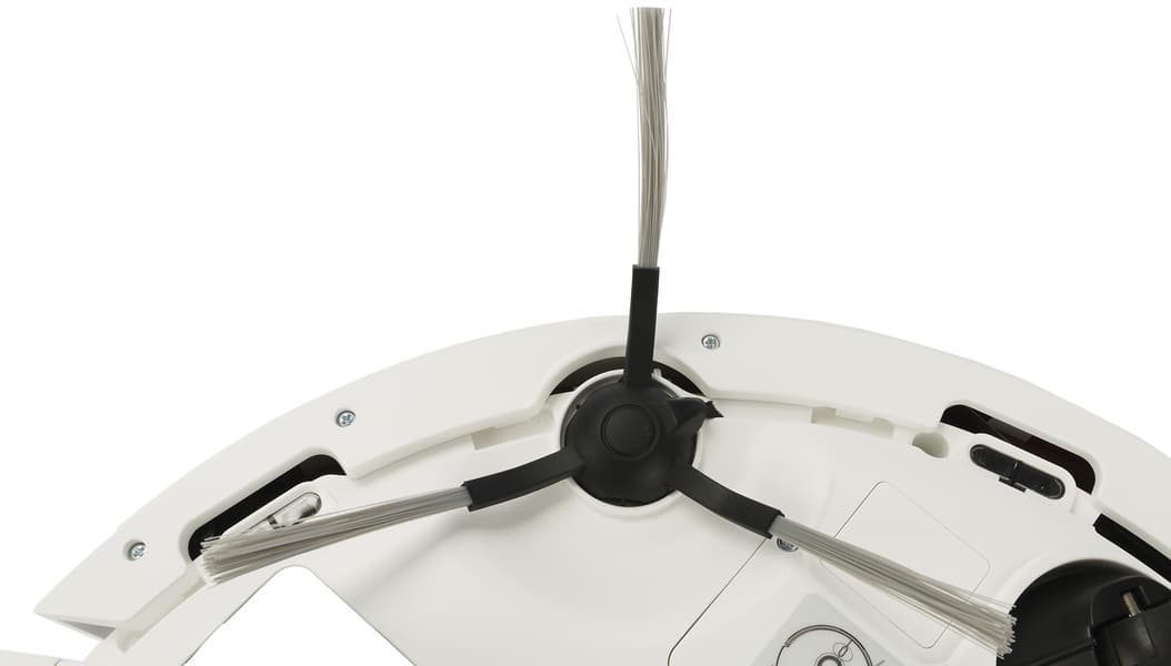 Единственная боковая щетка установлена на правой (если смотреть сверху) стороне, между ведущим и опорным колесами. Она крепится с помощью защелки и фиксируется на своем месте с небольшим нажатием.