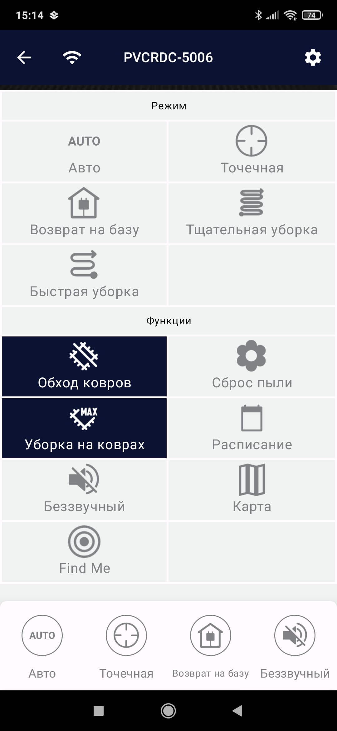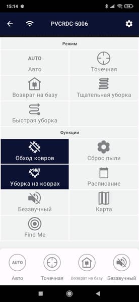 Поскольку у нашего робота есть датчик ковровых покрытий, в приложении появились соответствующие кнопки. Мы можем указать роботу, чтобы он обходил ковры стороной, либо наоборот — пылесосил их на повышенной мощности.
