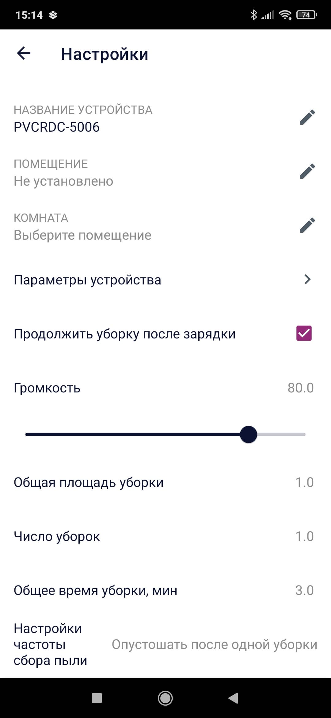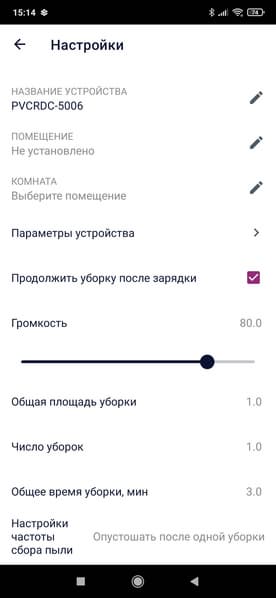 На главном экране нам также покажут уровень заряда, время последней уборки и убранную площадь (в квадратных метрах).
