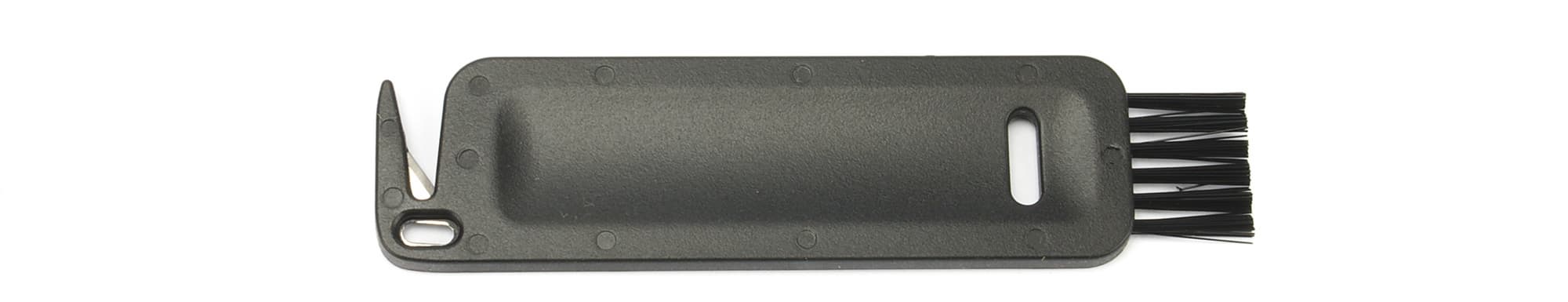 Если щетки робота требуют очистки, можно воспользоваться специальным приспособлением, которое есть в комплекте у этой модели. Лезвие предназначено для срезания ниток, шерсти и длинных волос, а щетка подойдет для снятия прилипшего мусора со щетины и выметания его из уголков пылесборника.