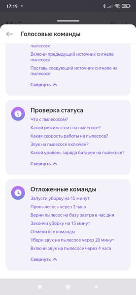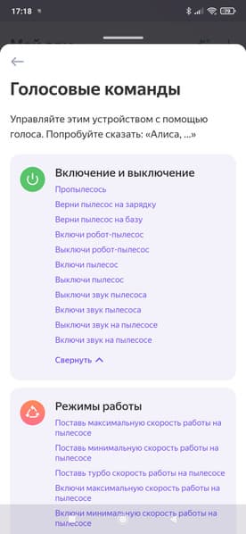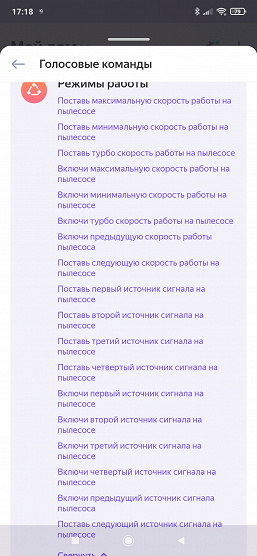 Если открыть список голосовых команд, то мы можем оценить все возможности голосового управления. И снова видим загадки типа «Поставь третий источник сигнала на пылесосе». Команд, отвечающих за влажную уборку, мы также не обнаружили.