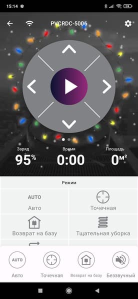 После запуска мы видим типичный «пульт управления». Тут мы можем начать управлять устройством в ручном режиме, запустить уборку или отправить устройство на базу.