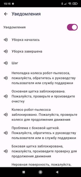 Об успешно завершенной уборке или неполадках в работе робот извещает пользователя женским голосом на русском языке (надо сказать, голос у прибора приятный и раздражения не вызывает). Голосовой пакет при желании можно сменить.