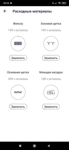 Как мы уже упоминали, в приложении можно фиксировать этапы обслуживания устройства — время очистки контейнера для пыли, очистки фильтра, замены боковой или основной щетки, после чего на экране смартфона можно будет следить за износом расходных материалов (вычисляется в рабочих часах) и примерно понять, когда они потребуют внимания пользователя.