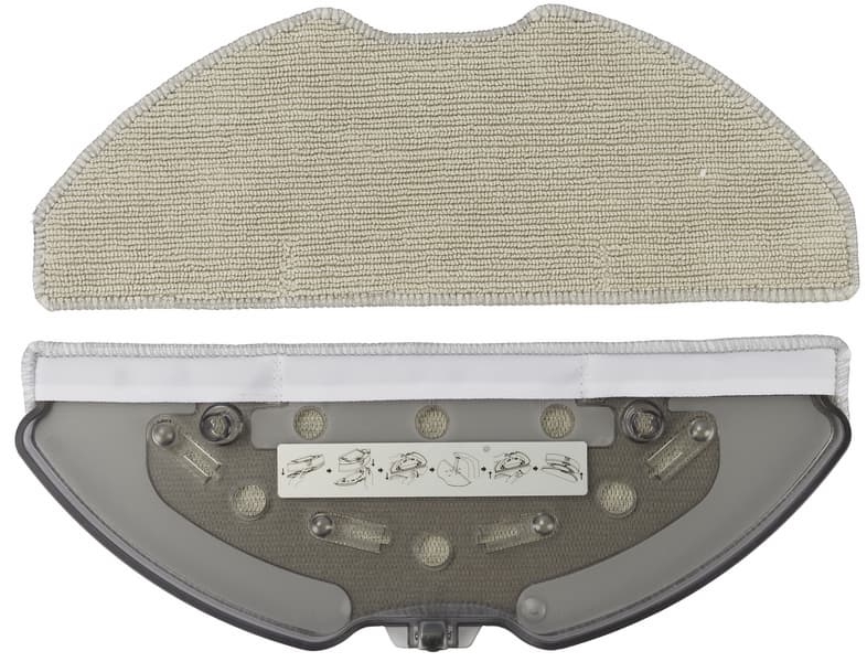Для влажной уборки нам также придется прикрепить к роботу специальную «подошву», к которой, в свою очередь, с помощью липучек-велкро и небольшого «кармашка» крепится моющая салфетка. На рамке мы нашли наклейку с инструкцией по очистке системы влажной уборки.
