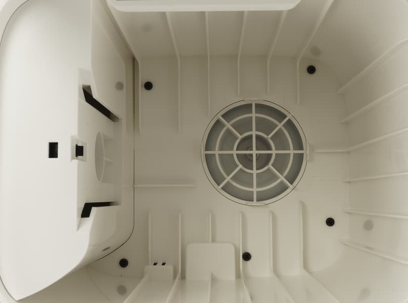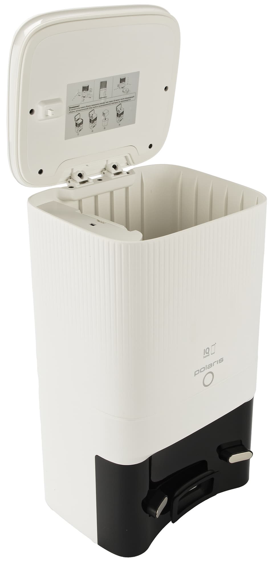 На крышке мусоросборника наклеена этикетка, объясняющая, как правильно опустошать емкость, а на боковой стороне мы найдем градуировку, позволяющую узнать, сколько воды осталось в баке.