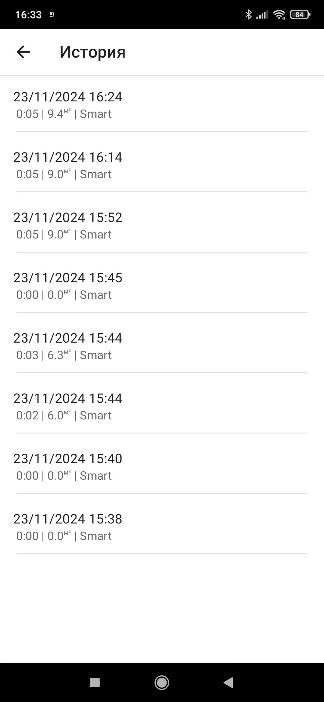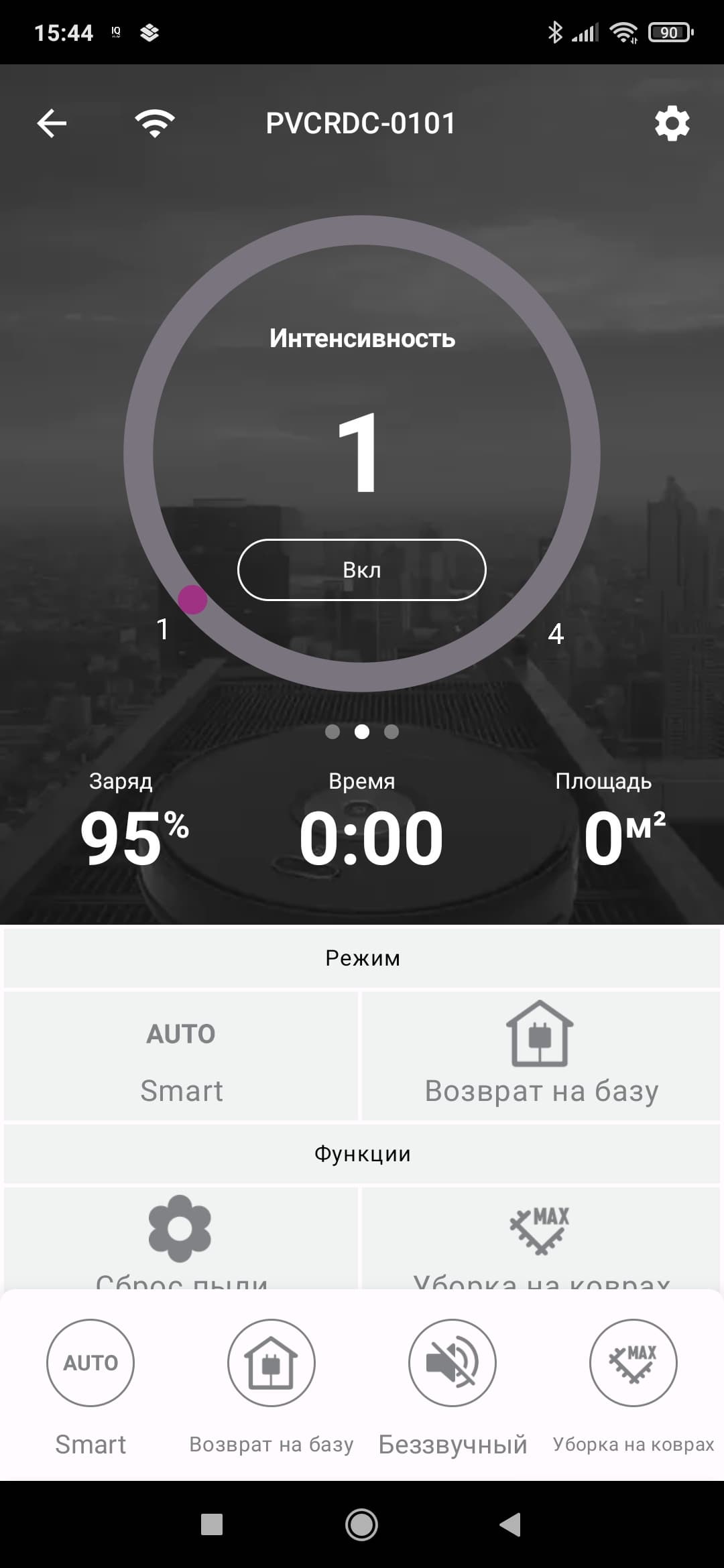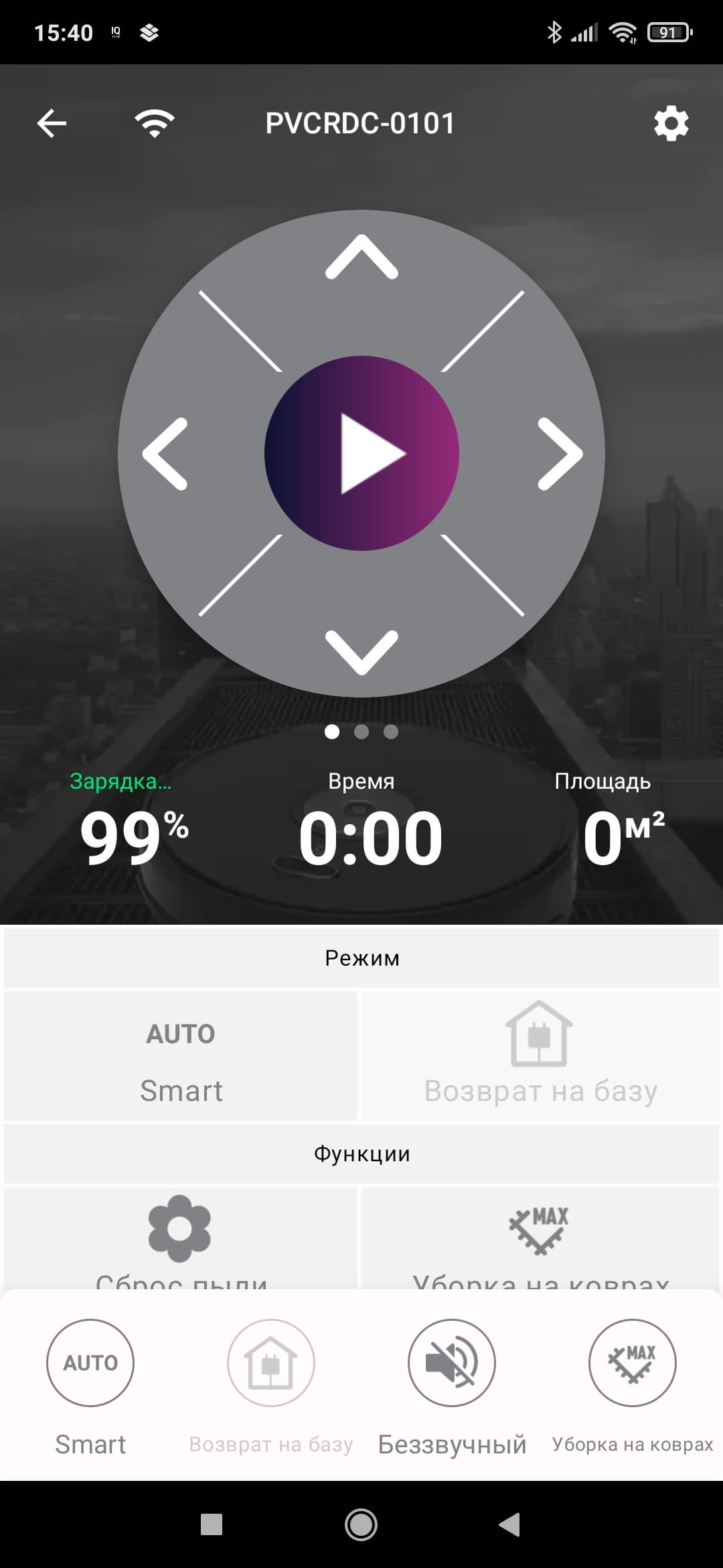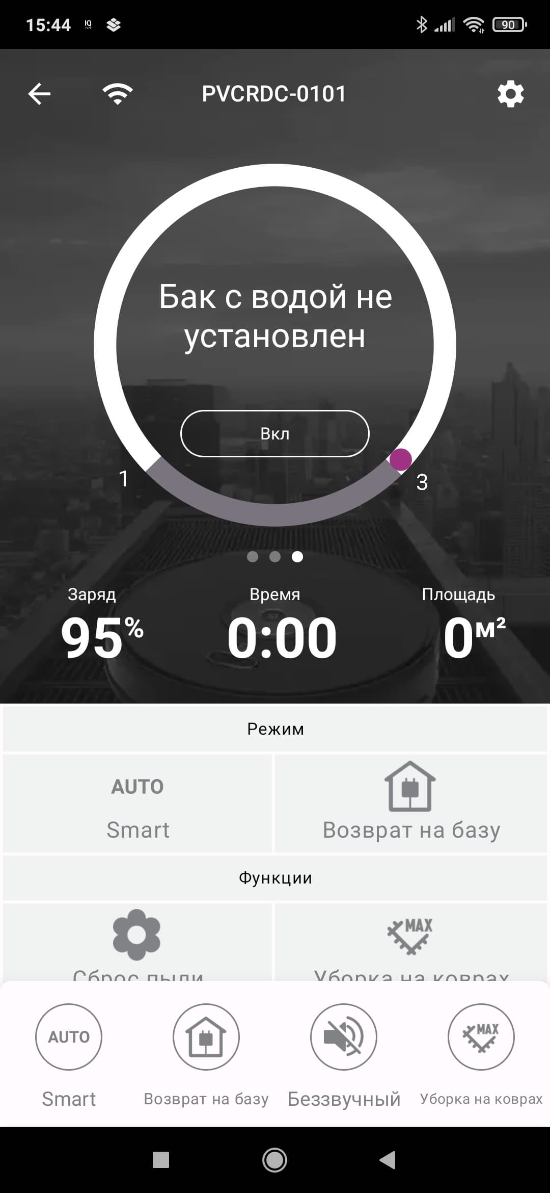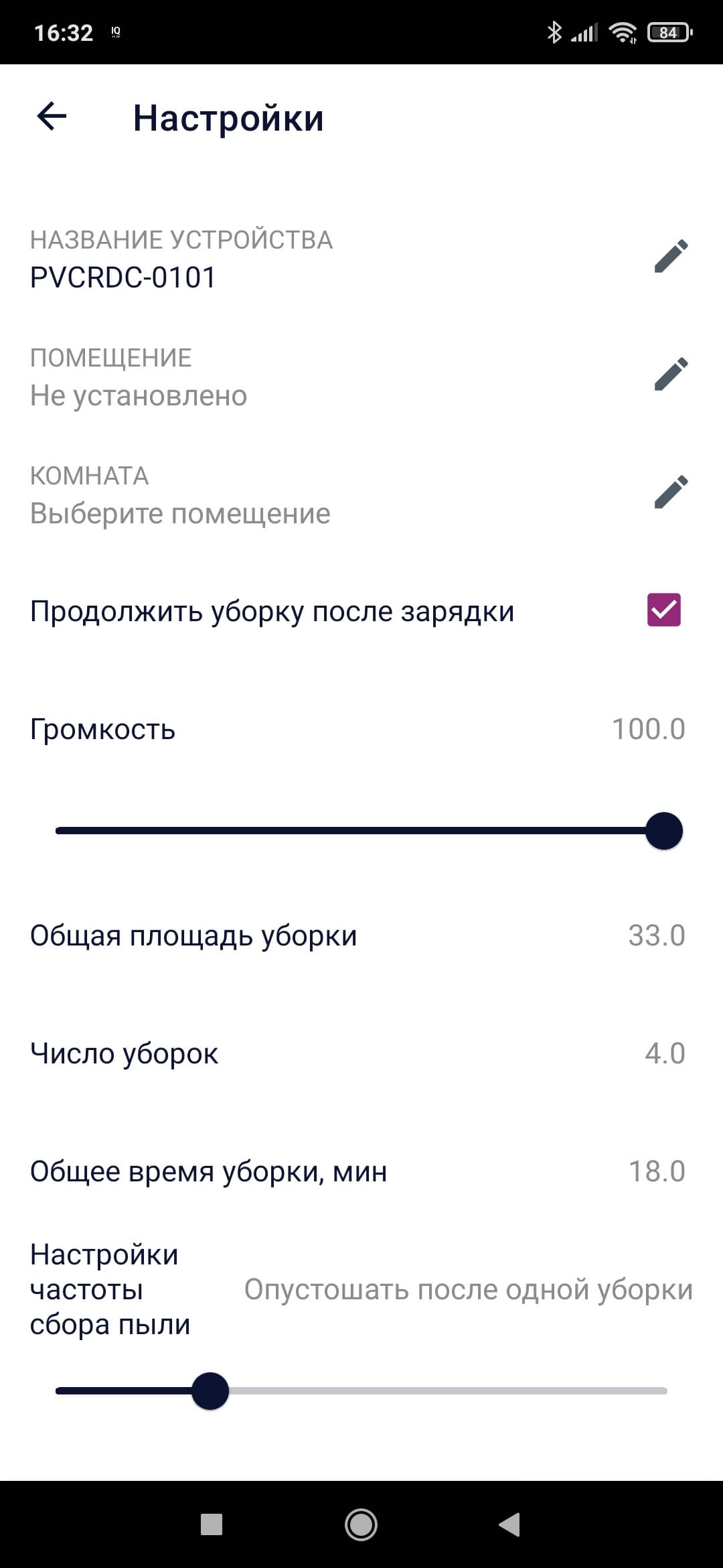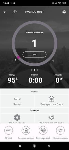 На главном экране нам также покажут уровень заряда, время последней уборки и убранную площадь (в квадратных метрах).