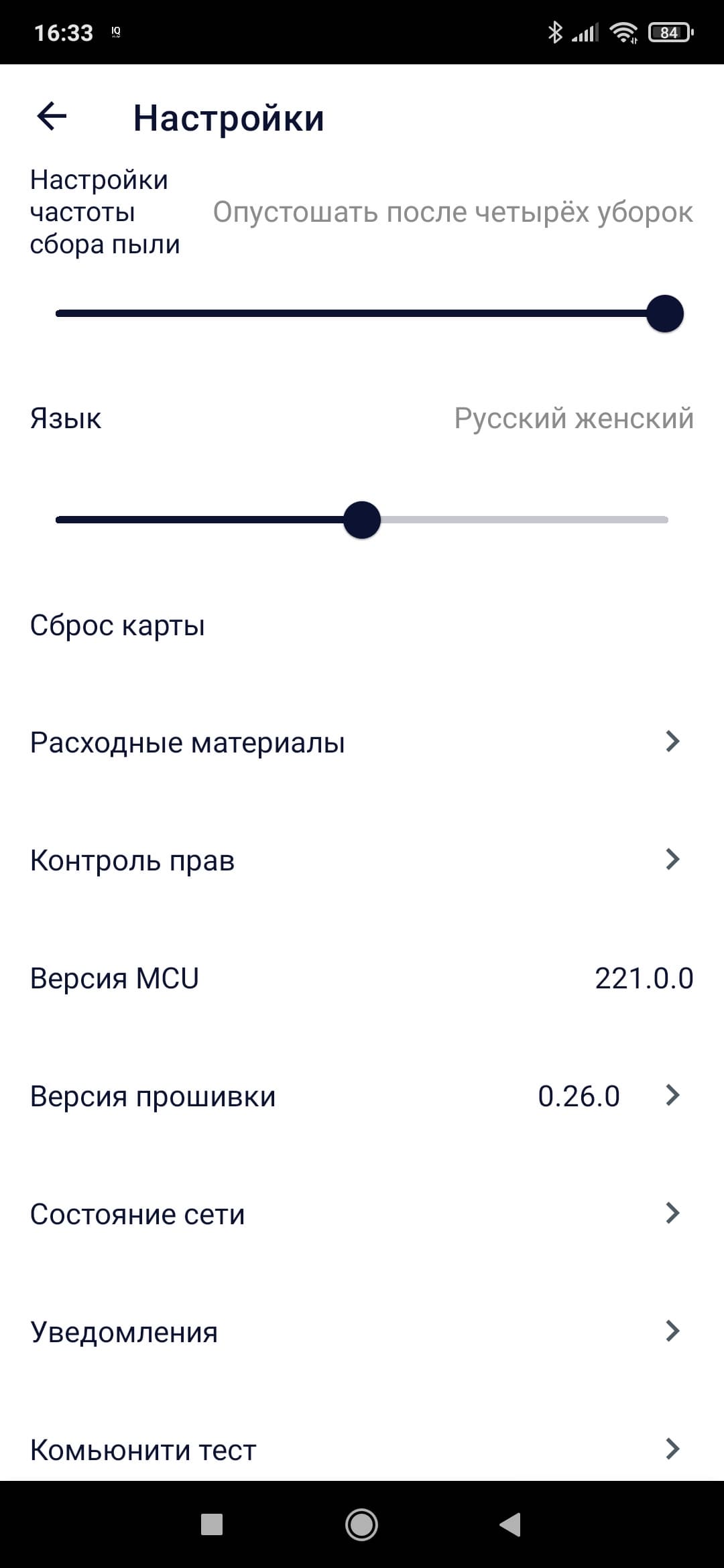 В разделе «настройки» мы можем изменить еще несколько опций, посмотреть статистику уборок и степень износа расходных материалов, настроить громкость, язык робота и уборку по расписанию и т. п. Отметим, что тут же мы можем передать права на управление роботом другим пользователям (например, членам семьи).
