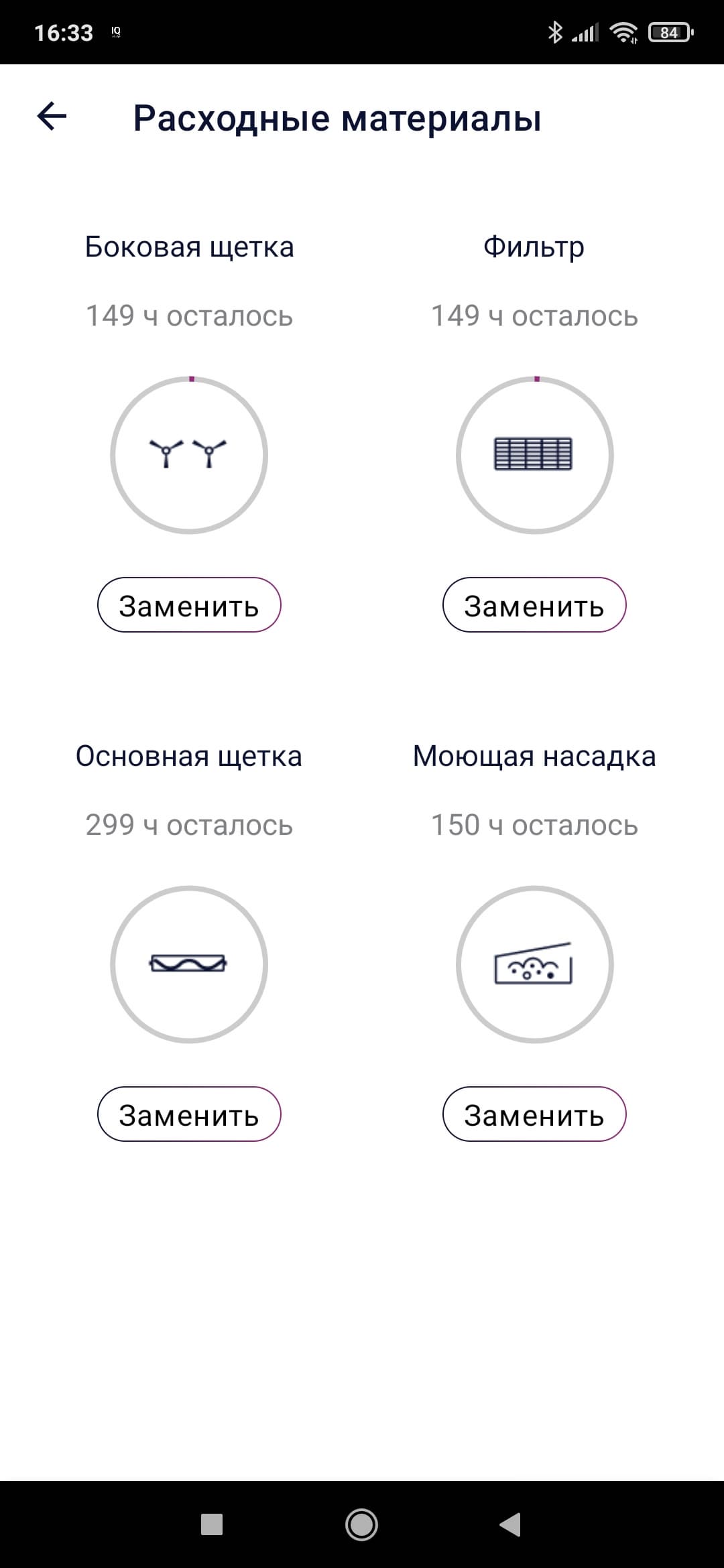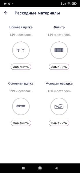 Как мы уже упоминали, в приложении можно фиксировать этапы обслуживания устройства — время очистки контейнера для пыли, очистки фильтра, замены боковой или основной щетки, после чего на экране смартфона можно будет следить за износом расходных материалов (вычисляется в рабочих часах) и примерно понять, когда они потребуют внимания пользователя.