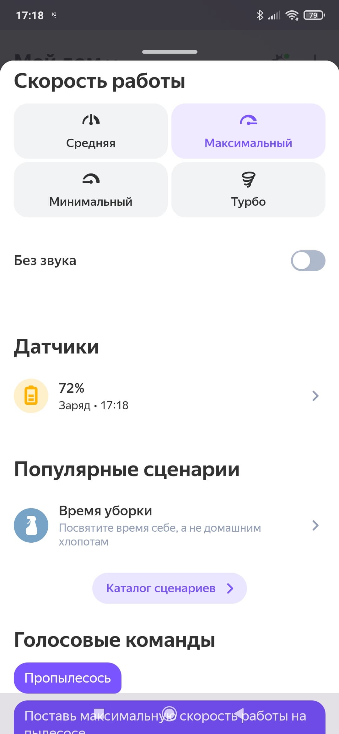 Пылесос допускает управление с помощью голосового помощника (Алисы или Маруси). Мы проверили, насколько удачно реализована данная функция.