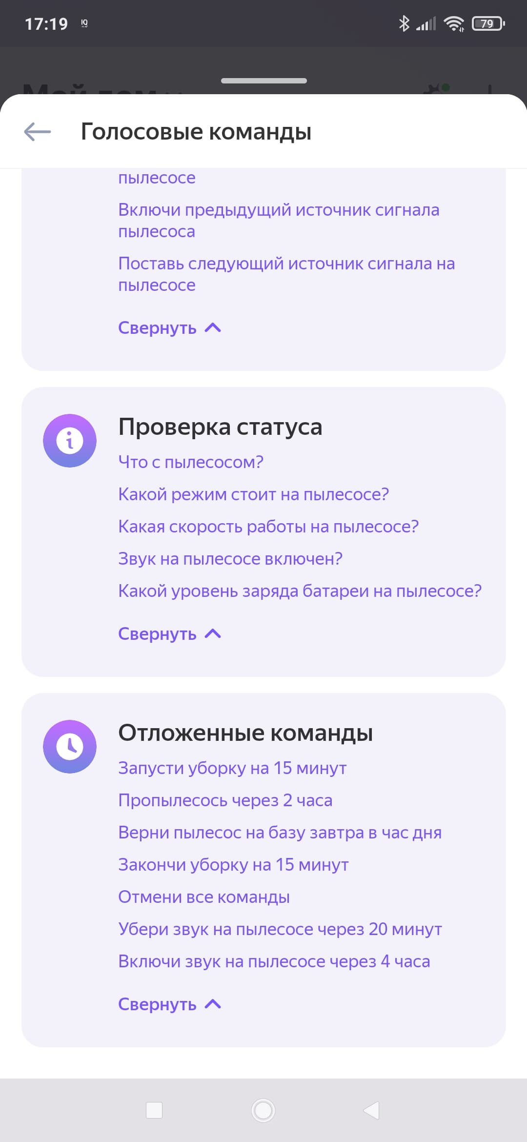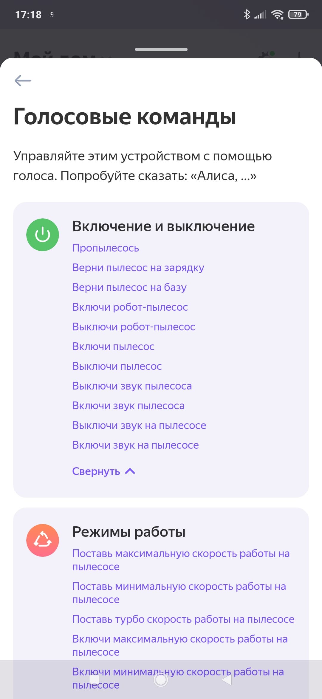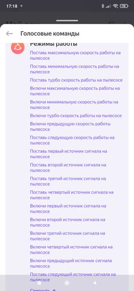 Если открыть список голосовых команд, то мы можем оценить все возможности голосового управления. И снова видим загадки типа «Поставь третий источник сигнала на пылесосе».