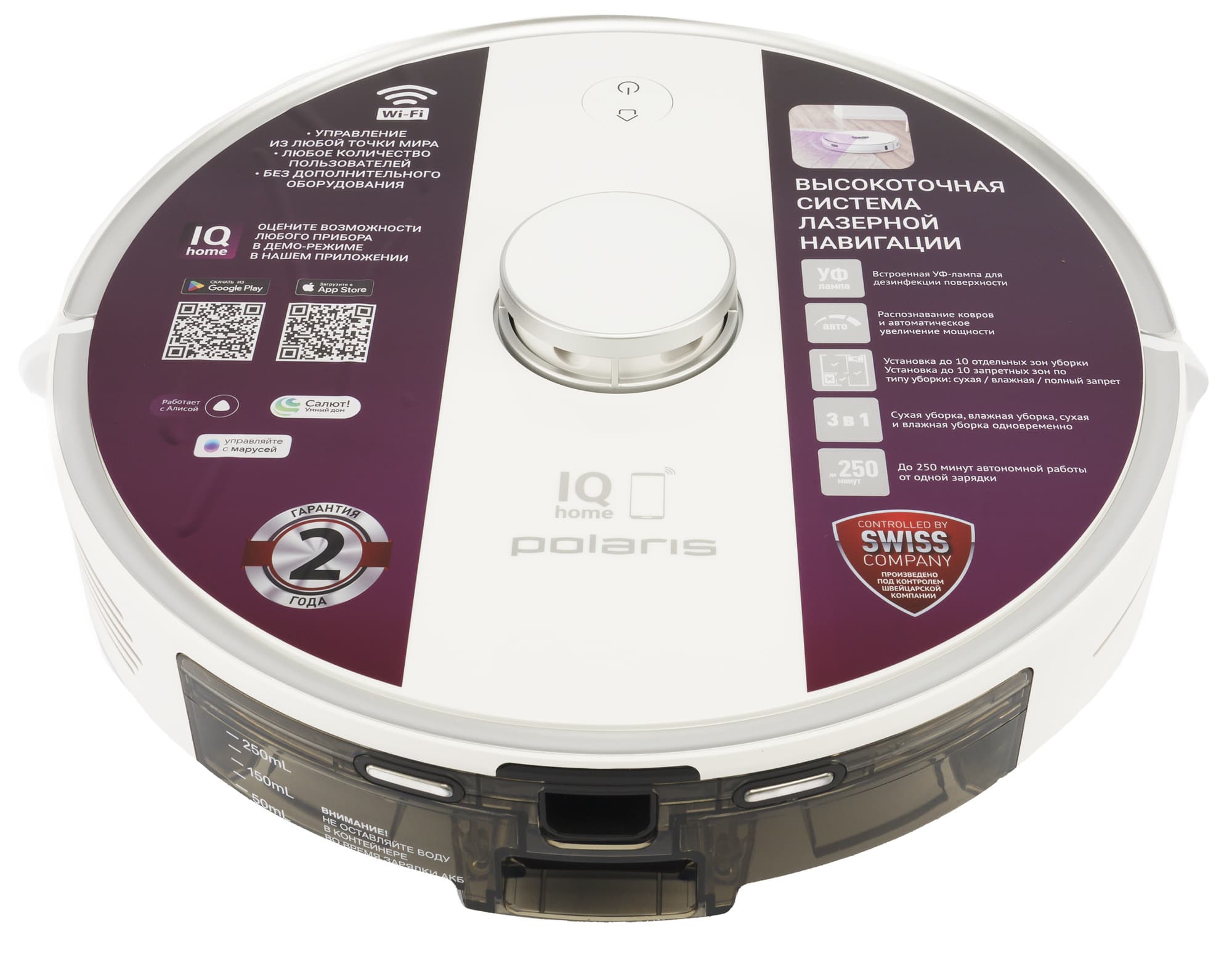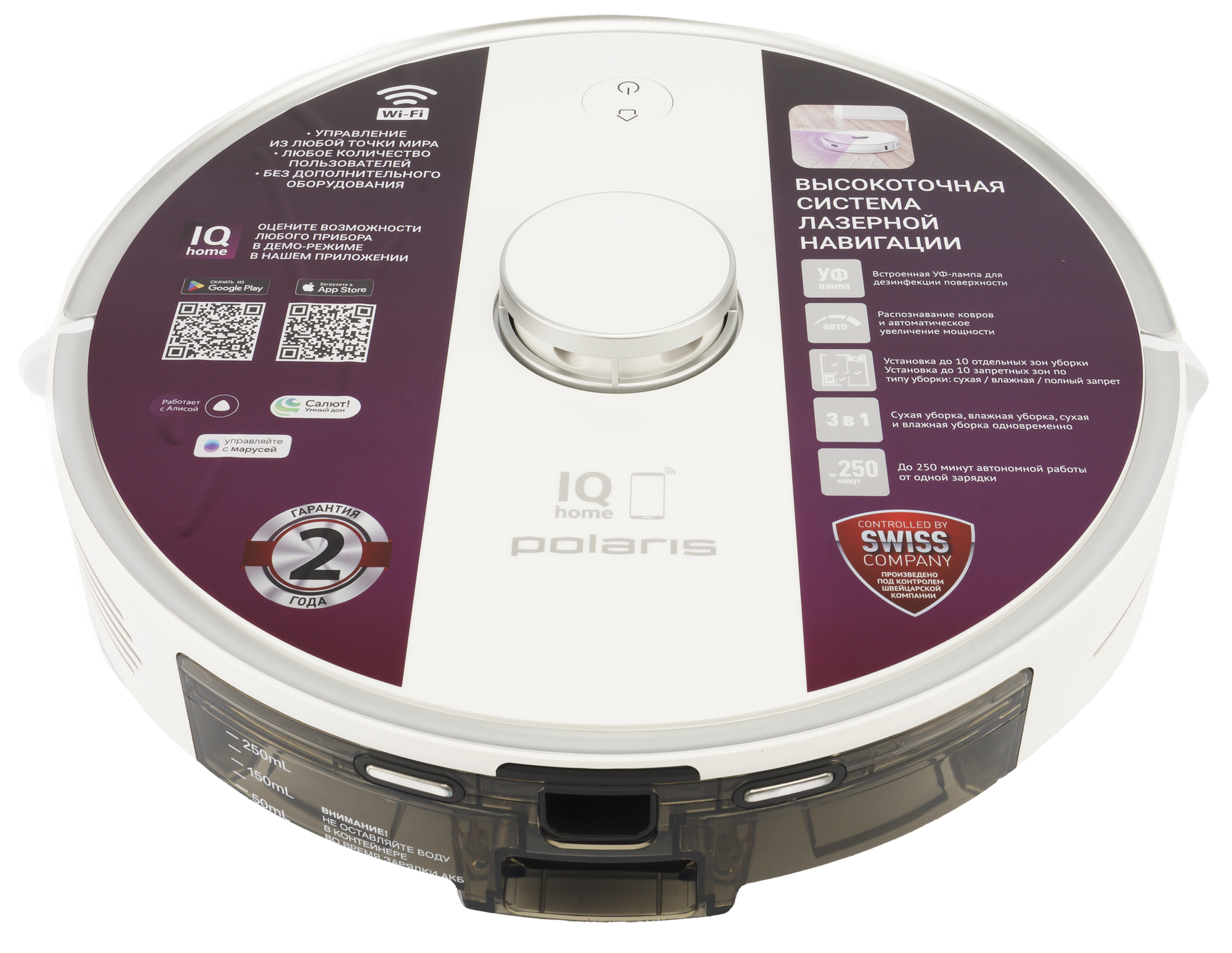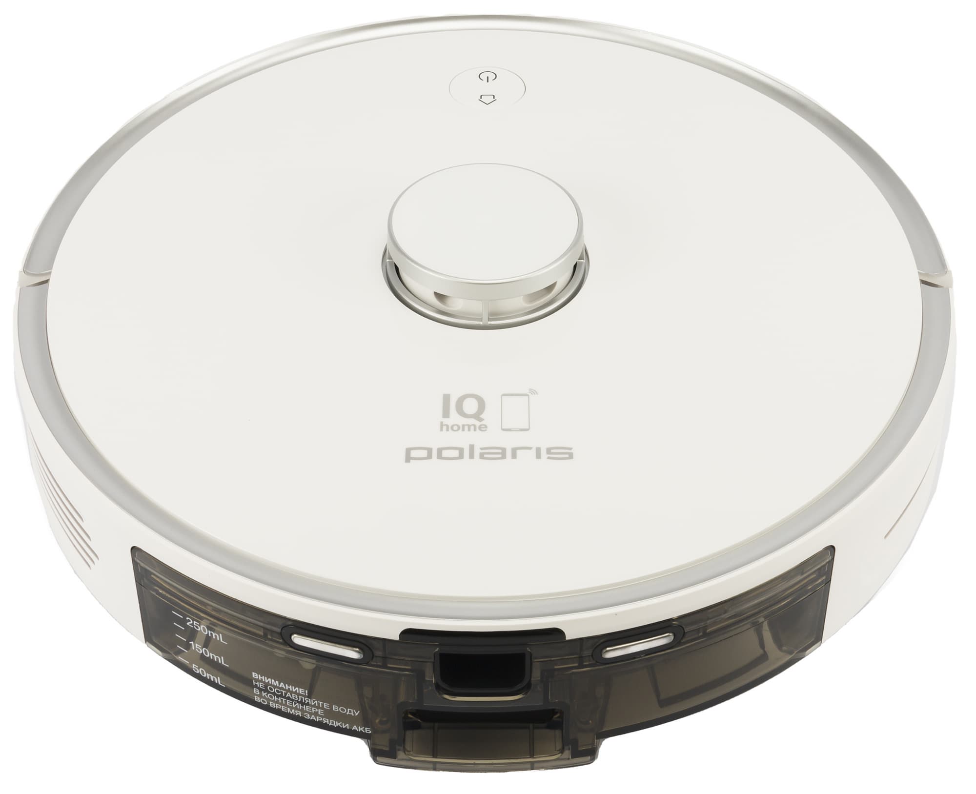 Дизайн простой, но строгий — верхняя панель украшена логотипом Polaris и изображением смартфона с подписью IQ Home. В целом можем сказать, что перед нами предстал классический строгий пылесос для дома или офиса.