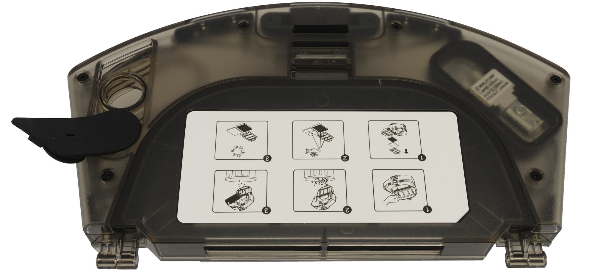 На крышке мусоросборника наклеена этикетка, объясняющая, как правильно опустошать емкость, а на боковой стороне мы найдем градуировку, позволяющую узнать, сколько воды осталось в баке.