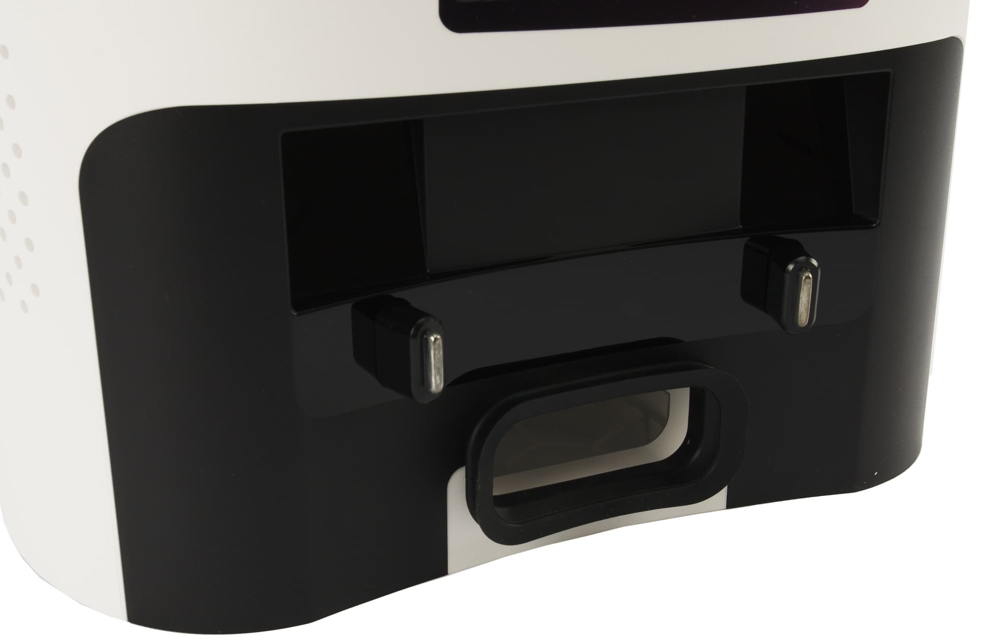 На корме хорошо заметны два металлических контакта, обеспечивающие зарядку, и окошко для самоочистки, через которое базовая станция удаляет мусор из контейнера.
