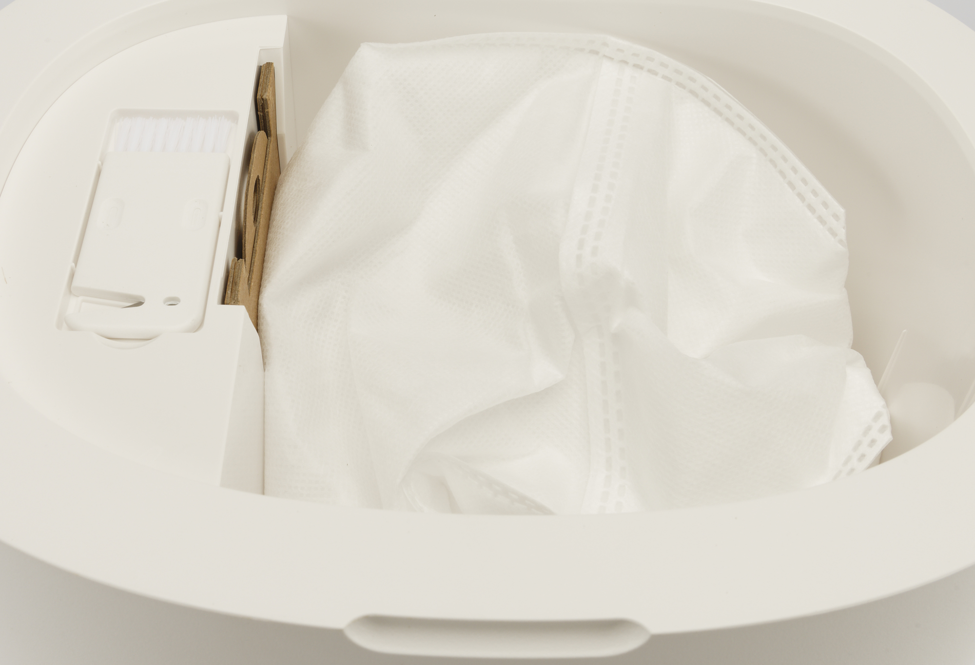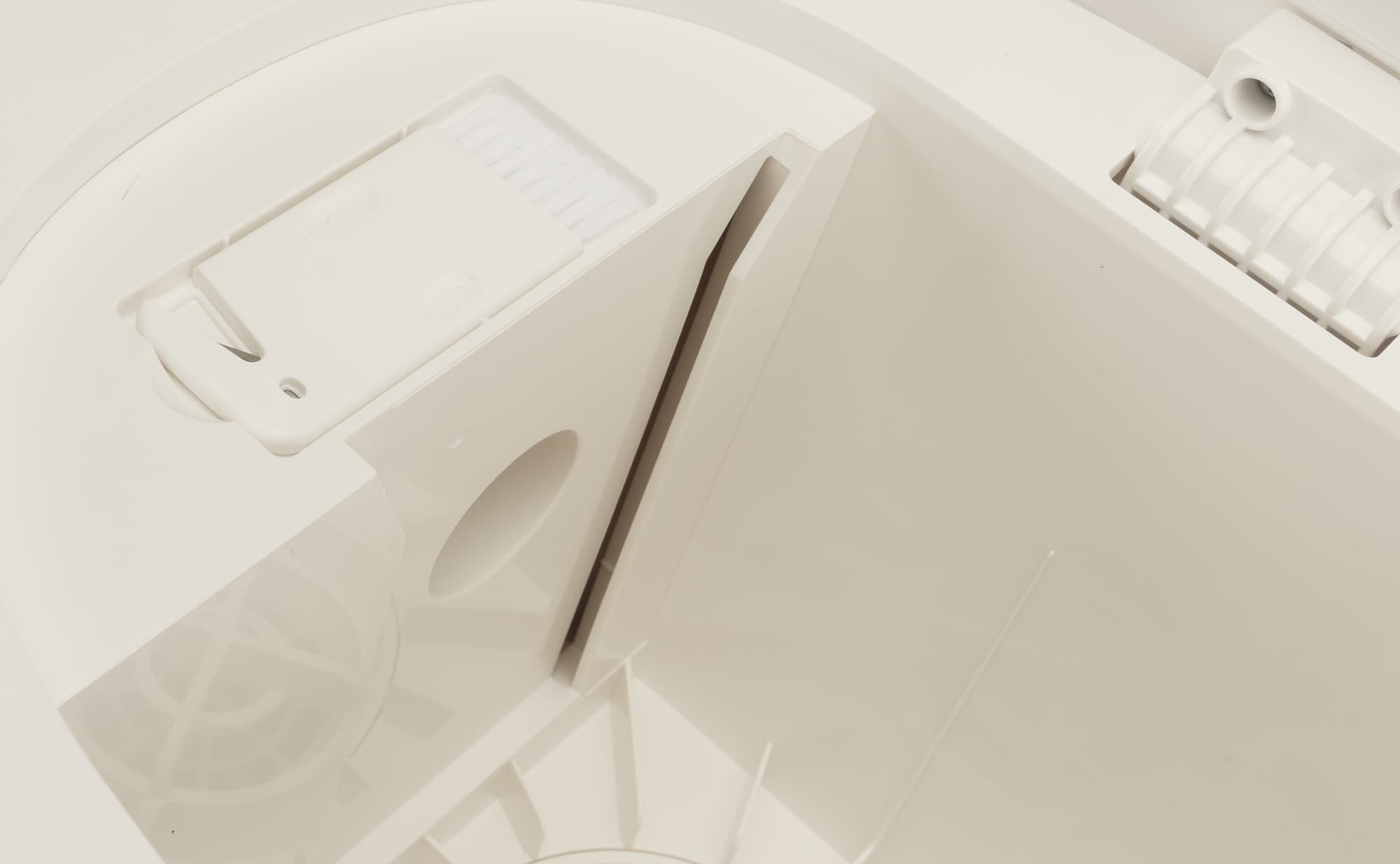 Под откидной крышкой прячется отсек для установки трехлитрового мешка для сбора пыли. Поток воздуха с пылью и мусором покидает контейнер и направляется в одноразовый пакет, установленный в отсеке станции. Посадочное место под него оборудовано специальным датчиком, и без мешка функция самоочистки не включится.