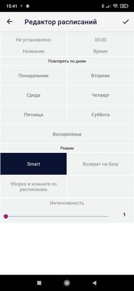 Прибор исправно включается и выключается, возвращается на базу для подзарядки, меняет мощность всасывания, а также позволяет запланировать отложенную уборку (понимает команды типа «пропылесось через 2 часа»).