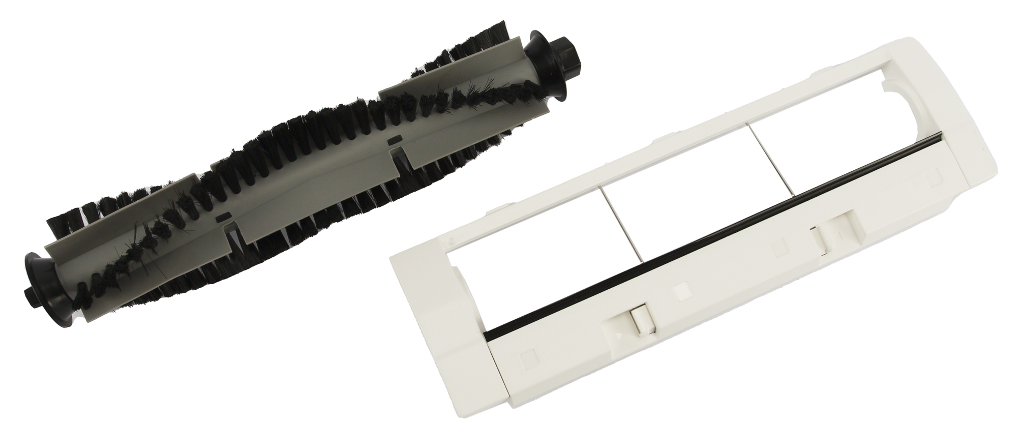 Отсек для щетки закрывается с помощью пластиковой рамки, оснащенной двумя защелками. Рамка подвижна — она имеет небольшой ход по вертикали, что обеспечивает наилучший контакт щетки с полом. Для защиты центральной щетки от проводов, ниток и тому подобных предметов предусмотрены две металлические перемычки.