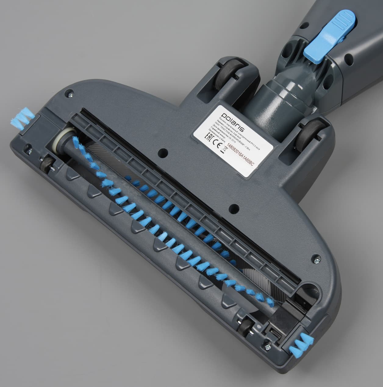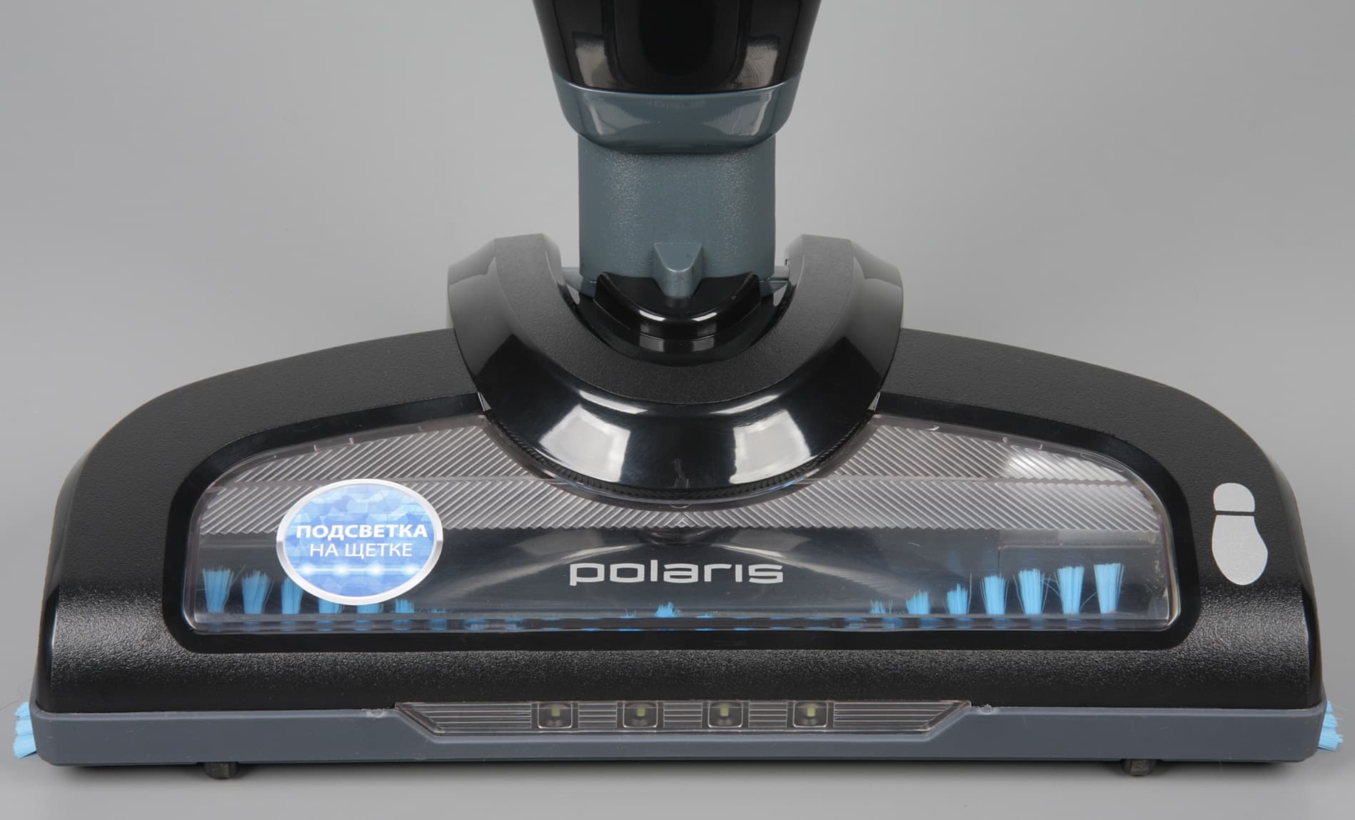 Перемещение насадки по полу облегчают четыре ролика с покрышками из упругого пластика. Качество уборки в темных закоулках помогает контролировать расположенная в передней части линейка из четырех ярких светодиодов белого свечения. Снизу на насадке есть каналы для воздуха, помогающие засасывать пыль сбоку и спереди впритык к насадке. Резиновый подвижный скребок за отсеком щетки уменьшает паразитный подсос воздуха. Сбоку в торцах установлены дополнительные щеточки. Однако основная работа по удалению мусора возложена на активную щетку, оснащенную электрическим приводом. Волнообразное расположение пучков жесткой щетины снижает шум от работы щетки на жестких поверхностях. На валу щетки есть две канавки, благодаря которым с вала проще срезать все то, что на него намоталось.