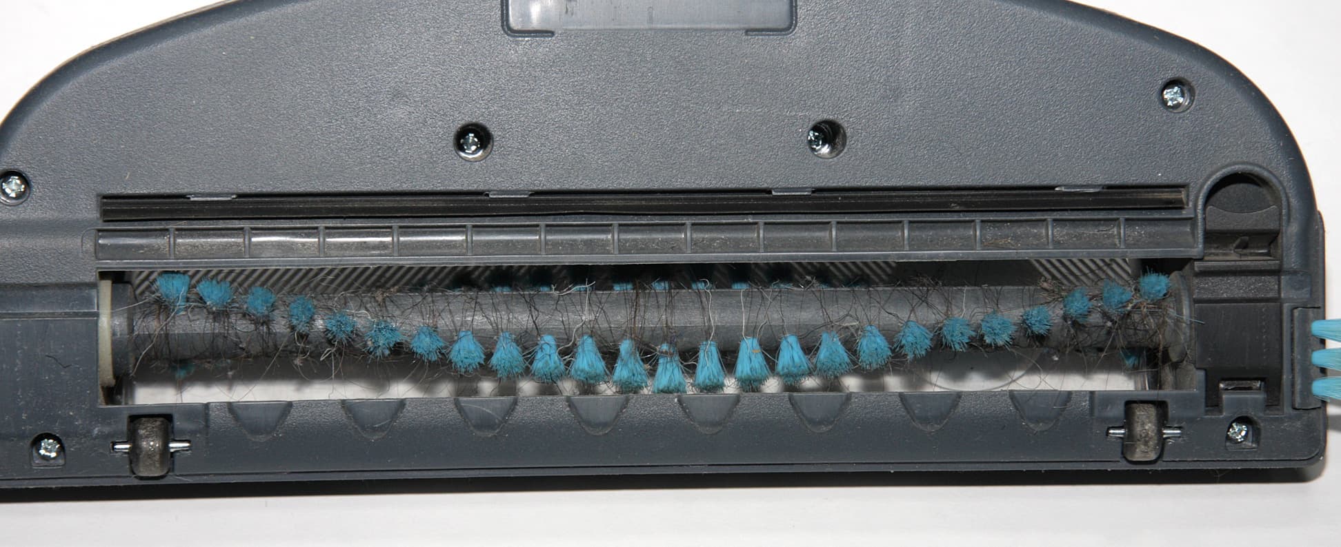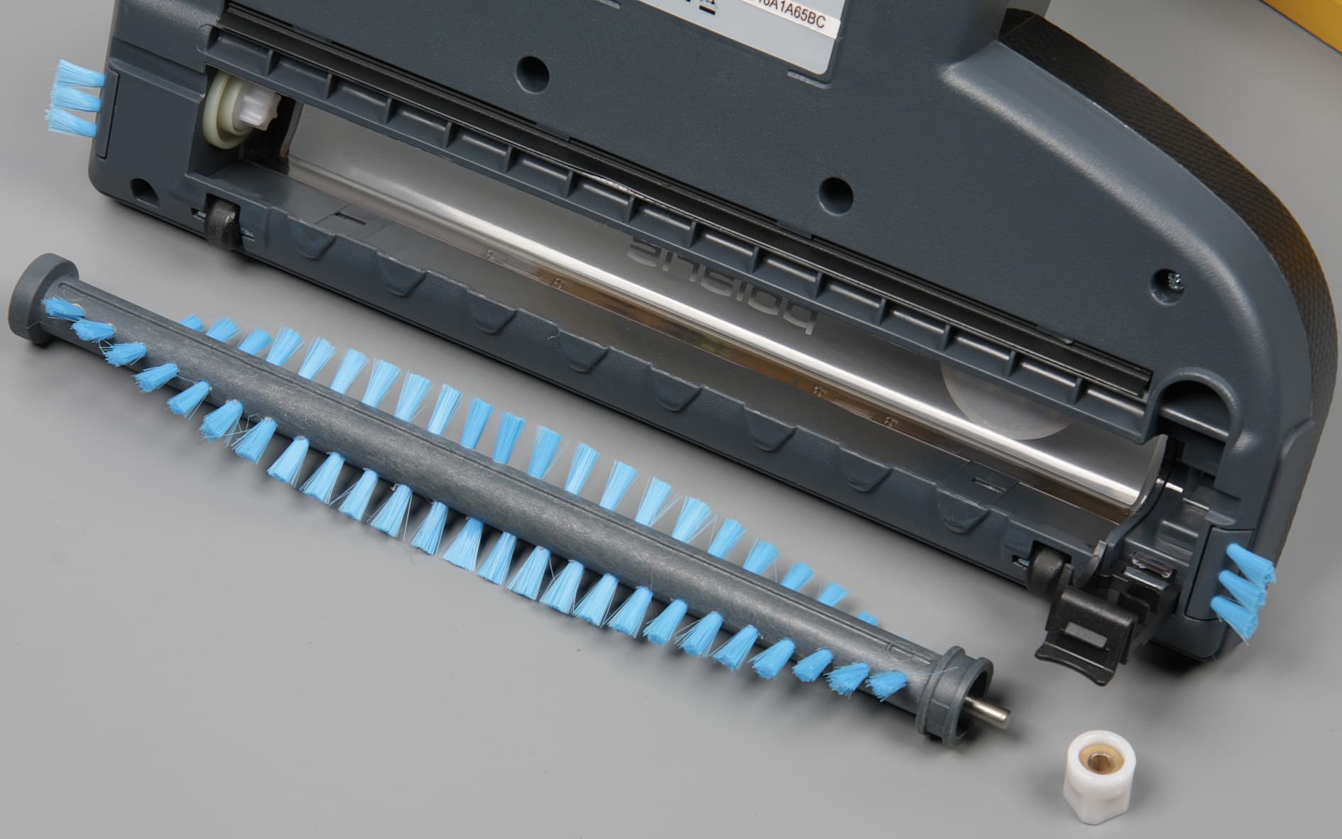 Стальная ось с одного торца щетки вращается в подшипнике скольжения из цветного сплава. Во вращение щетка приводится с помощью зубчатого привода, зацепляющегося за ответное гнездо в другом торце щетки. Передняя и боковые поверхности корпуса насадки имеют обрамление из упругого пластика, что снижает вероятность повреждения мебели. Чтобы из вертикального пылесоса получить ручной портативный, нужно нажать на кнопку с надписью Hand vac и вытащить блок мотора с пылесборником из основного корпуса.