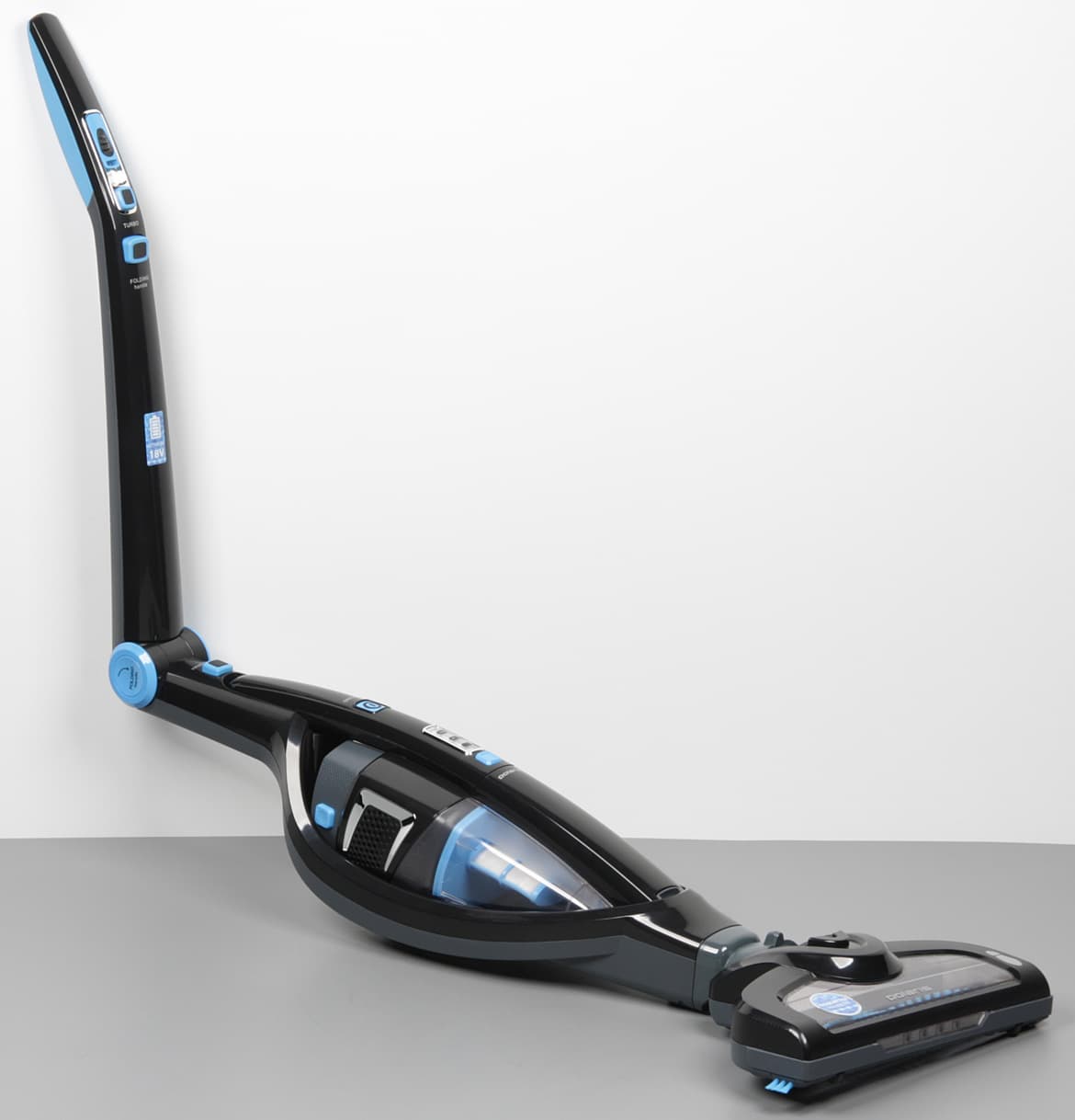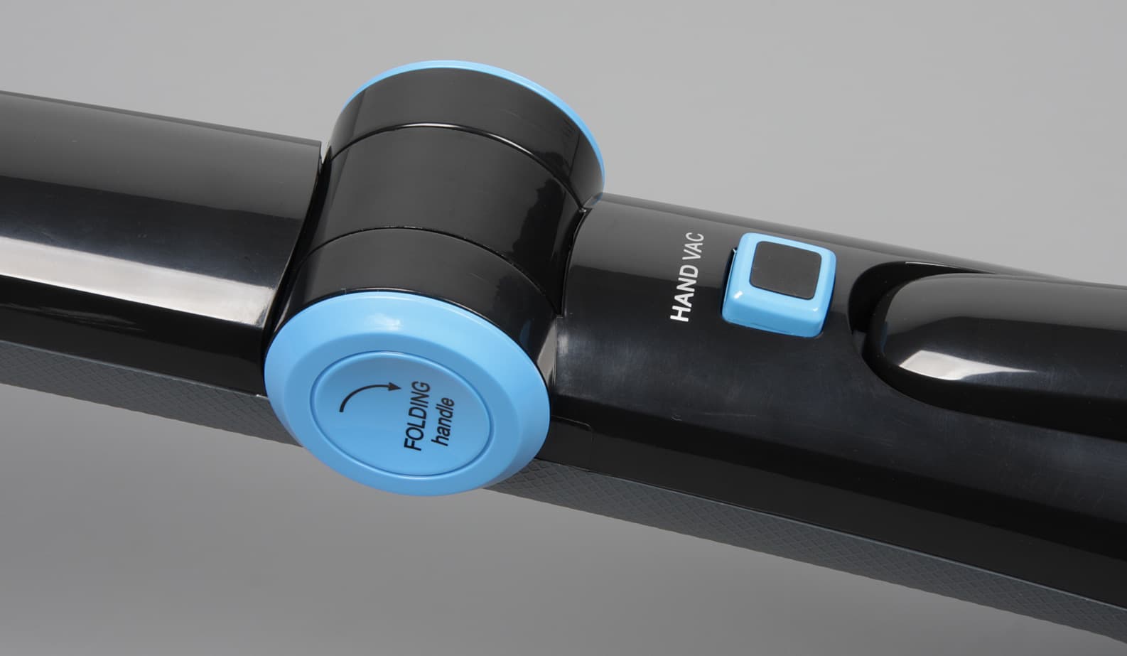 Основные детали пылесоса изготовлены из пластика в основном черного или темно-серого цвета без покрытия с просто матовой шершавой поверхностью, с рельефным узором или с зеркально-гладкой поверхностью, которая, конечно, не устойчива к появлению царапин. У выпускных решеток, под переключателем режимов и вокруг индикатора заряда есть декоративные рамки с прочным зеркальным металлизированным покрытием. Нижняя часть ручки основного корпуса, где ее держит пользователь, имеет противоскользящую накладку из упругого пластика голубого цвета. Нижняя часть ручки мобильного блока просто шершавая. Голубые элементы обычно обозначают органы управления или нажимные фиксаторы, но вот крышки шарнира — это просто крышки, так как кнопка фиксатора шарнира находится выше. Нажав на эту кнопку ручку можно сложить вверх, чтобы, не нагибаясь, подсунуть нижнюю часть пылесоса под предметы обстановки.