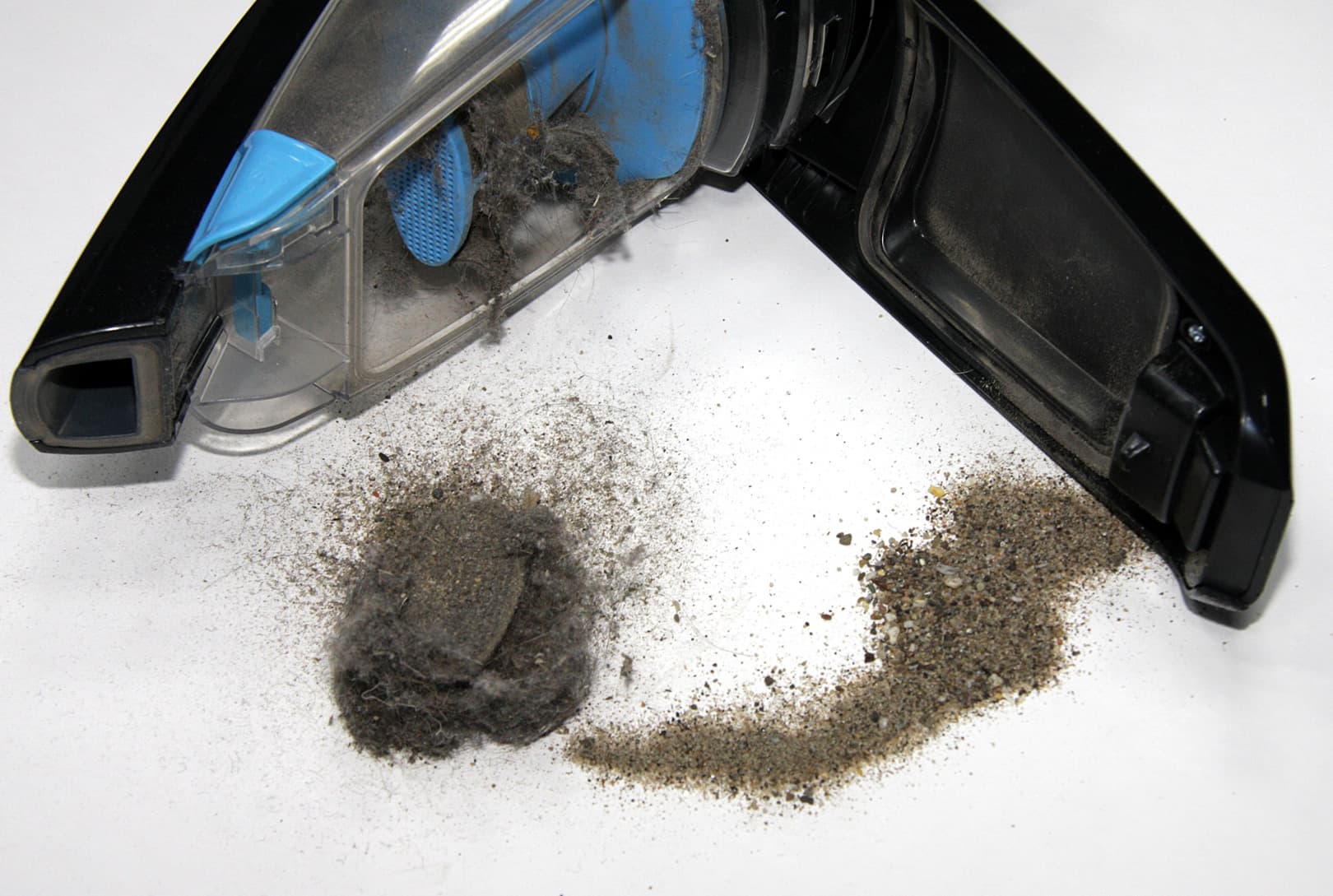 Обработав в режиме с максимальной мощностью и с включенной электрощеткой офисную площадь порядка 50 квадратных метров, мы извлекли мобильный блок, открыли крышку пылесборника и немного потрясли. Высыпался песок и мелкие камушки и вывалился комок мусора.