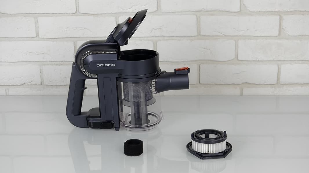 Прозрачный корпус пылесборника помогает быстро оценить степень его заполнения. При нажатии на фиксатор дно пылесборника откидывается. Внешний стакан с патрубком снимается при нажатии на кнопку сверху и после поворота на небольшой угол. Под крышкой сверху находится составной предмоторный фильтр HEPA 13.