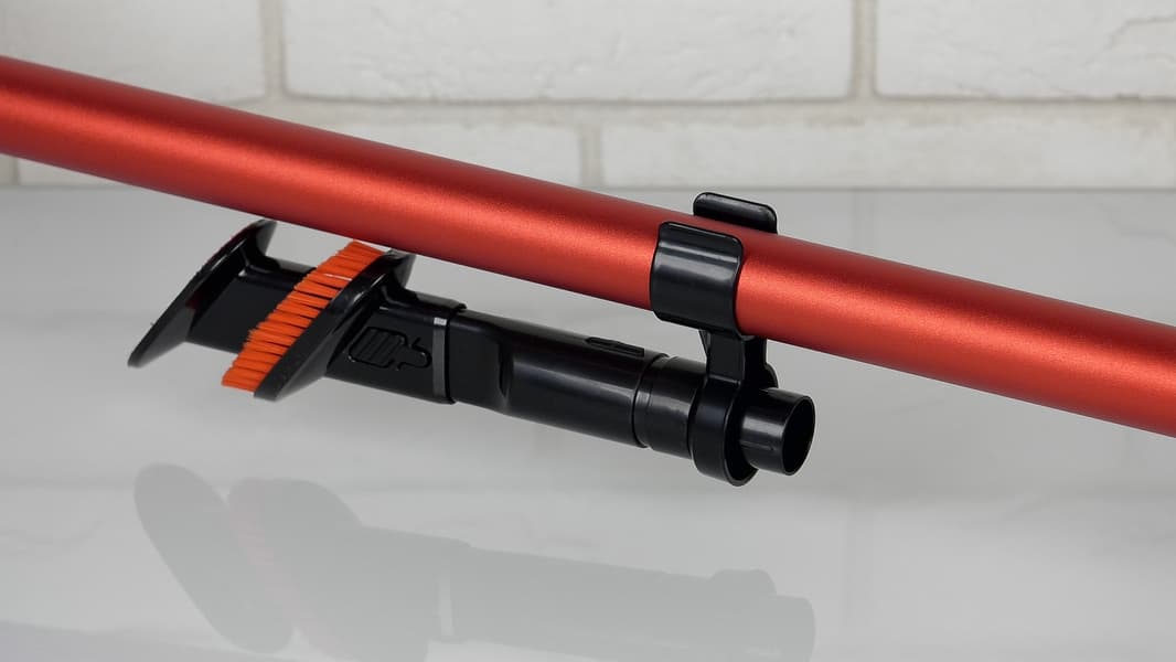 На легкую алюминиевую трубу можно поставить держатель. На нем удобно хранить комбинированную насадку три в одном, которая всегда будет под рукой во время уборки. Входящее в комплект поставки крепление позволяет повесить пылесос на стену.