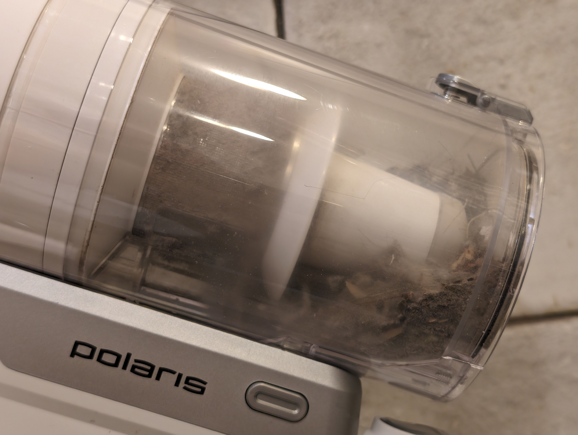 У большинства пылесосов подобной конструкции есть уязвимое место: участок на стыке тракта и контейнера, в котором поток воздуха меняет направление на 180°. В этой точке мусор может застревать, снижая производительность. В нашей же модели мы ни разу не столкнулись с подобной проблемой: удачное соотношение мощности и конфигурации воздушного тракта не позволяет мусору скапливаться в этом «бутылочном горле».
