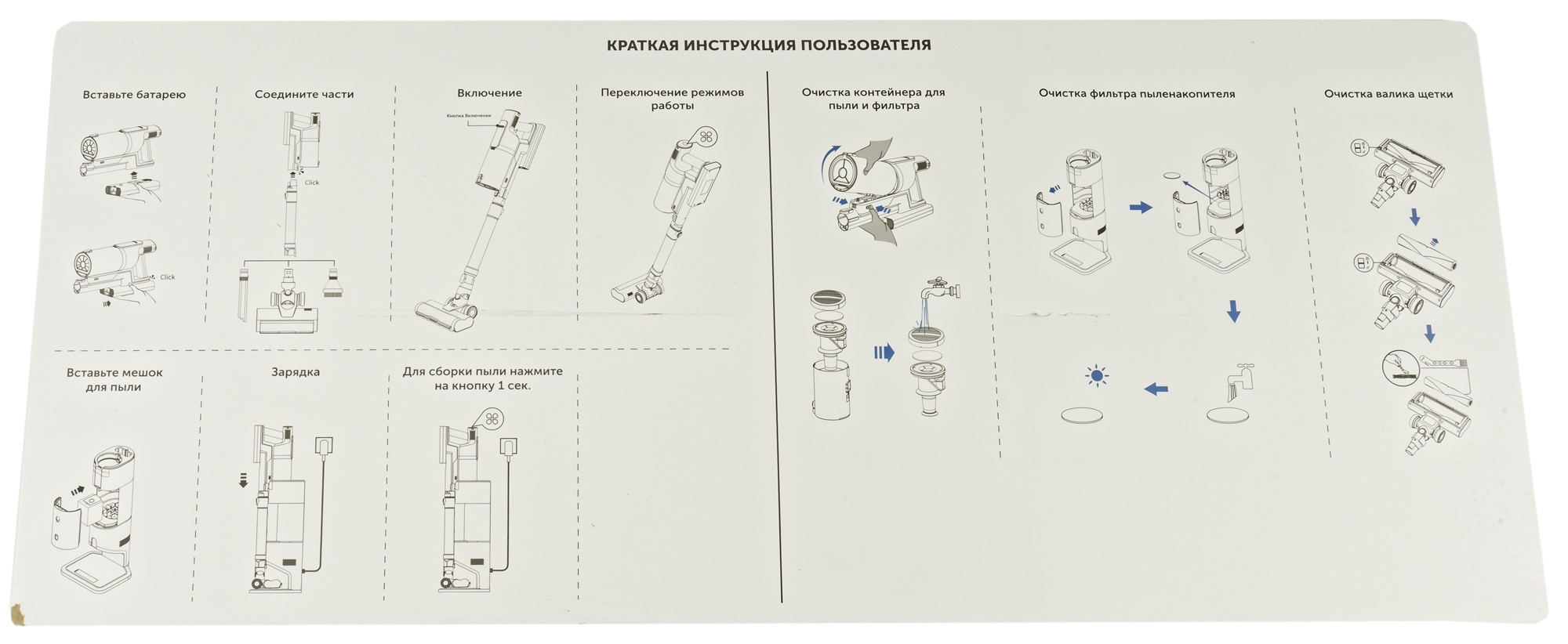Руководство составлено на трех языках — русском, украинском и казахском. Русскоязычная часть занимает 20 страниц. На них подробно описывается устройство прибора, его эксплуатация и правильный уход за ним. Для тех же, кому не терпится включить пылесос, не читая документации, производитель, как мы уже упоминали, вложил в коробку краткую инструкцию по быстрому старту.
