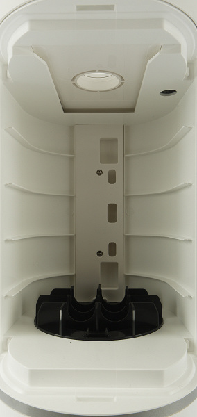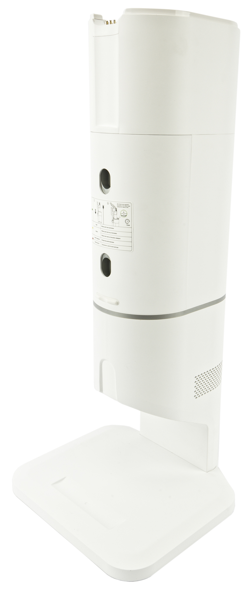 Станция для зарядки и самоочистки представляет собой белую колонну из того же матового пластика, что и корпус пылесоса. Она устойчиво опирается на прямоугольную подставку.