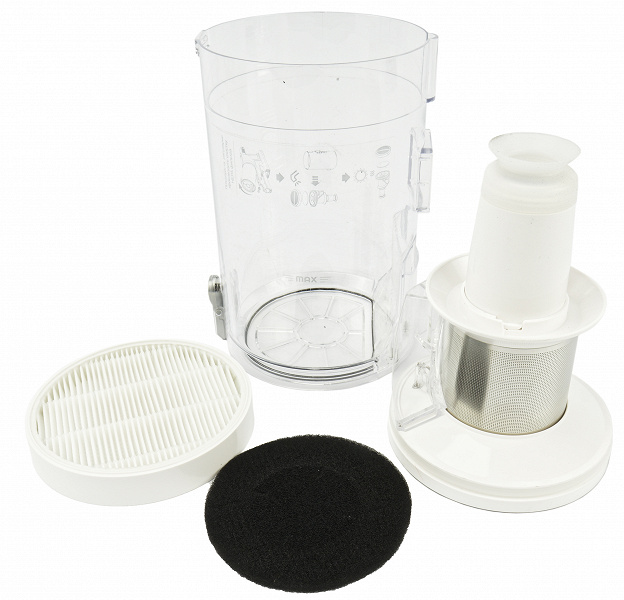 Поток воздуха с пылью и мусором попадает в цилиндр, закручиваясь вокруг центрального элемента. Более тяжелый и крупный мусор отбрасывается пластиковой «юбкой» и остается в нижней части, а мелкий фильтруется с помощью стальной сетки с микроперфорацией.