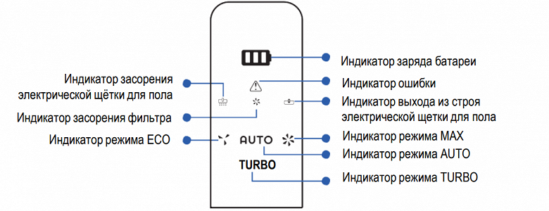 - «Turbo»: кратковременная работа с максимальным усилием. Этот режим, в отличие от трех остальных, активируется на 10 секунд длинным (2 секунды) нажатием на кнопку переключения мощности. По истечении десятисекундного таймаута пылесос возвращается на предыдущую программу.